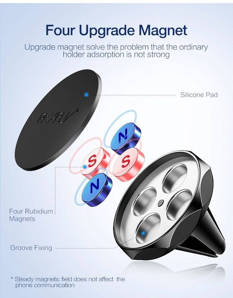 Держатель для телефона RAXFLY крепится на дефлектор с помощью металлической пружины, снаружи которой находится силиконовое покрытие. Такой крепеж не «разбалтывается» со временем, легко устанавливается и снимается. Держатель изготовлен из металла, содержит 4 мощных магнита. По качеству материалов и дизайну подойдет для «очень дорогого» автомобиля.