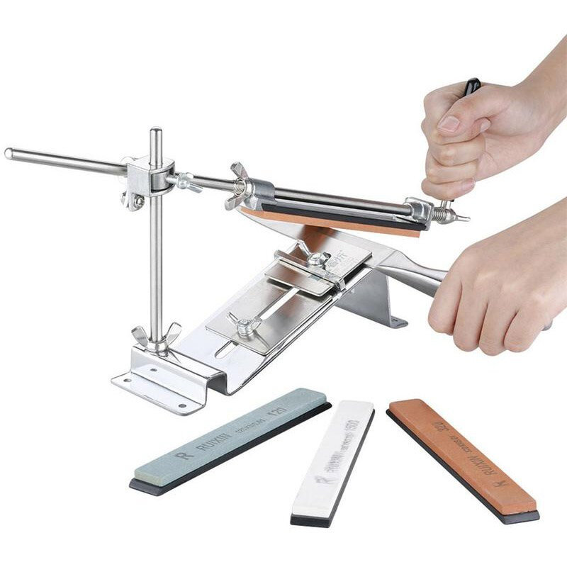 Ruixin Pro 3 - это универсальный точильный станок, точилка выделяется среди модельного ряда тем, что все ее части выполнены из стали, что существенно увеличивает срок ее службы. Главное преимущество данной заточной системы - фиксируемый угол, благодаря которому даже новичку удастся достичь в заточке выдающихся результатов. Нож или любой другой режущий инструмент фиксируется в точилке при помощи специального зажима. Это делается легко и просто, а дальше точилка все сделает за вас, стоит вам только расположить камень нужной зернистости на направляющей. Точить следует от крупного зерна к мелкому. Использовать все камни не обязательно - все зависит от степени затупления вашего ножа и повреждений, которые он получил в ходе эксплуатации. В набор входит 4 камня зернистостью: 120, 320, 600 и 1500 грит. Первый нужен в случае, если ваш нож получил серьезные повреждения, а последний создан для финишной доводки клинка. Точилка позволяет точно выставить желаемый угол заточки.