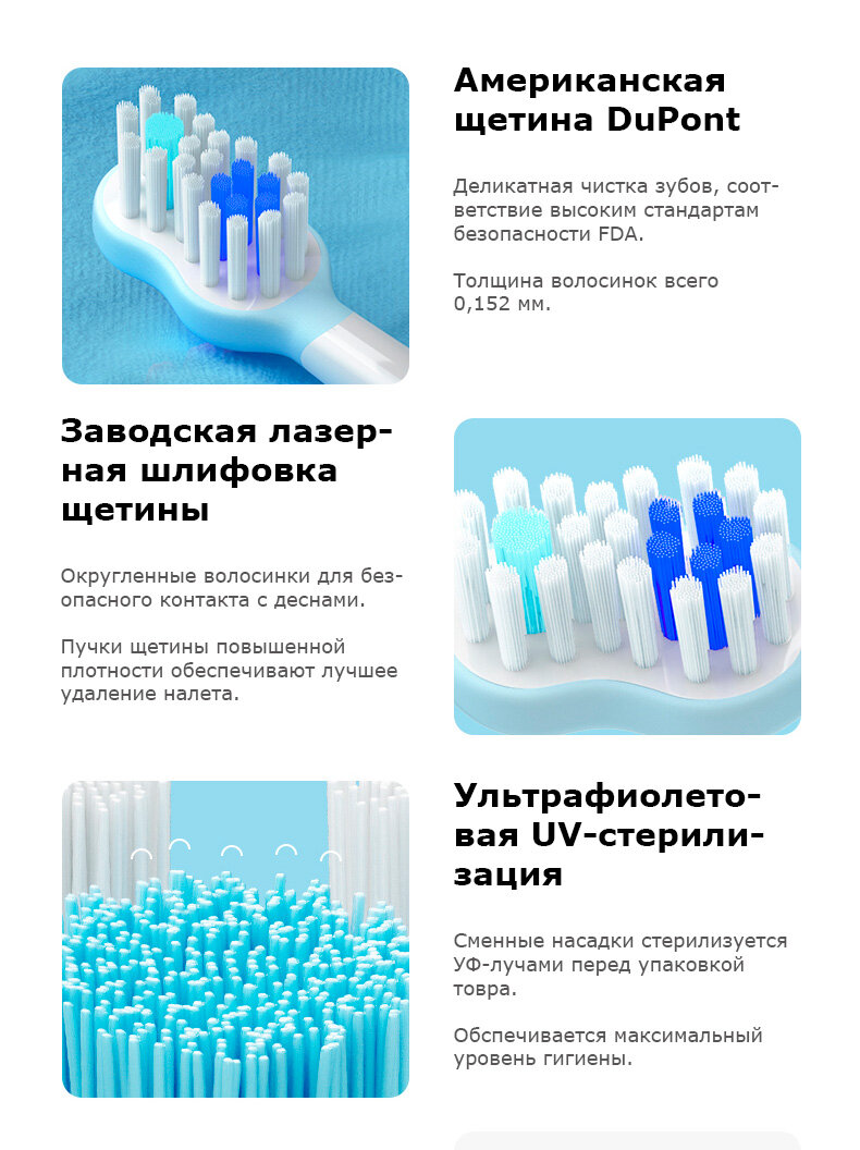 Головка содержит щетину диаметров - 0.152 мм. Чистка зубов будет деликатной и эффективной одновременно.