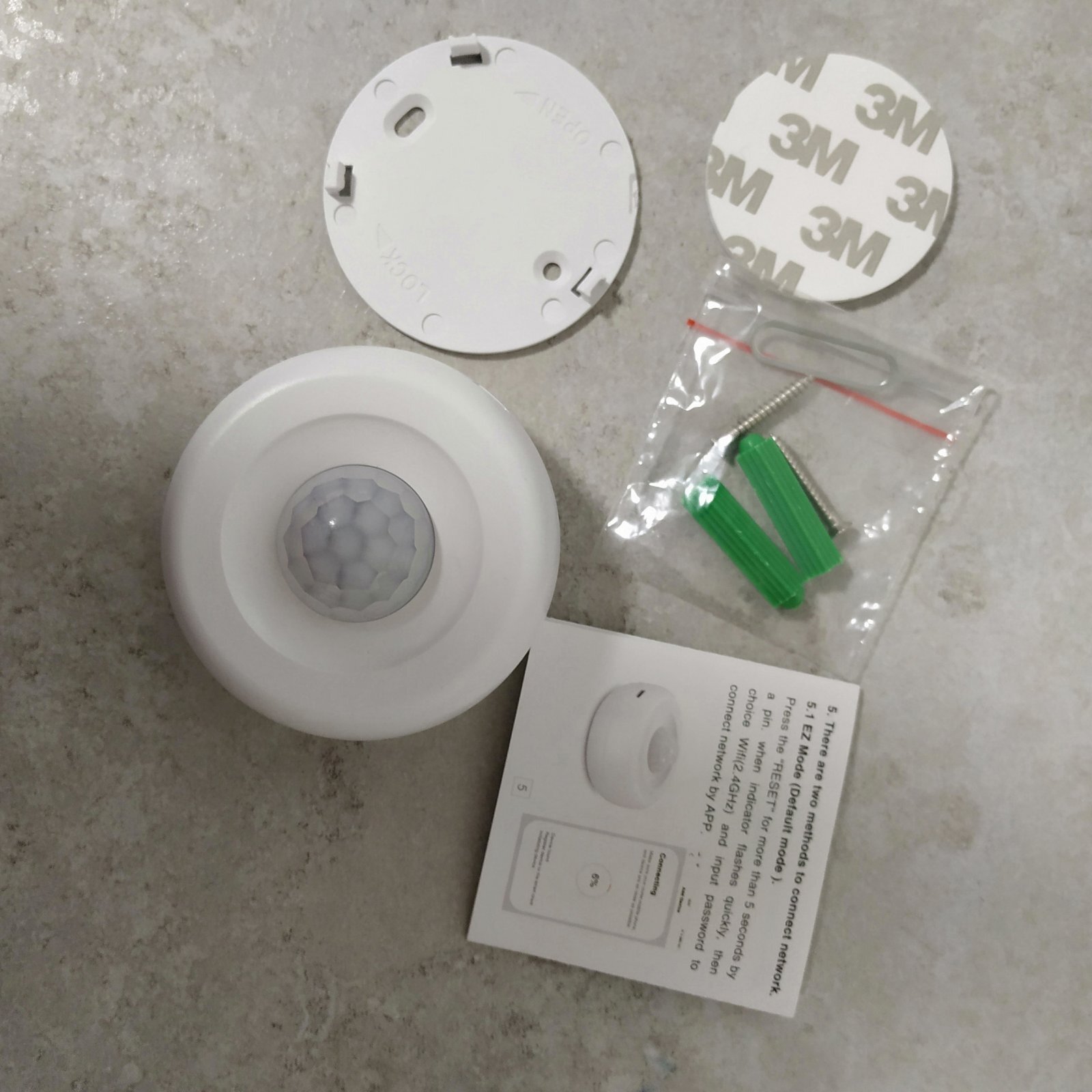 Комплектация: датчик, дюбеля, скотч 3М, инструкция на английском.