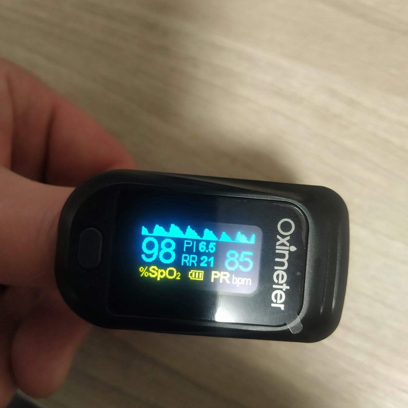 SpO2 – сатурацію (насичення киснем капілярної крові). Пульсоксиметр безперервно вимірює насичення крові периферичних судин киснем (напр., стопа, палець ноги чи руки) неінвазивним методом. Він використовується для спостереження за хворими, які схильні до ризику розвитку гіпоксії. Спостереження за SpO2 дає інформацію як серцево-судинної, так і про респіраторну систему, і надає докладну інформацію про перенесення кисню в крові.