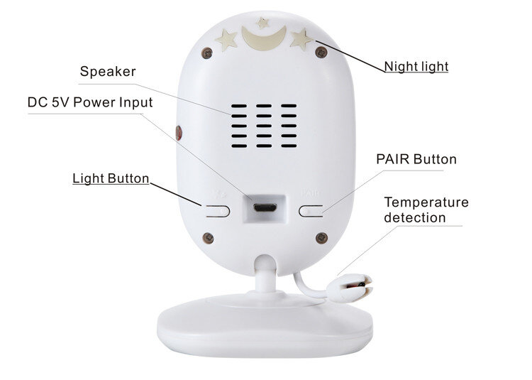 Пристрій складається з 2-х блоків - камери та монітора спостереження. Камера має невидиме нічне підсвічування та датчик температури. Завдяки вбудованому мікрофону та динаміку забезпечується двосторонній зв'язок - Ви зможете не тільки чути дитину, а й говорити з нею. Вбудований термометр виміряє температуру в приміщенні, де знаходиться малюк. Температура відображається на моніторі батьківського блоку.