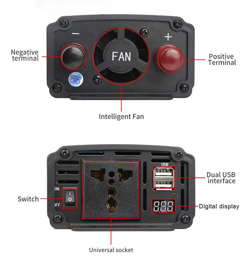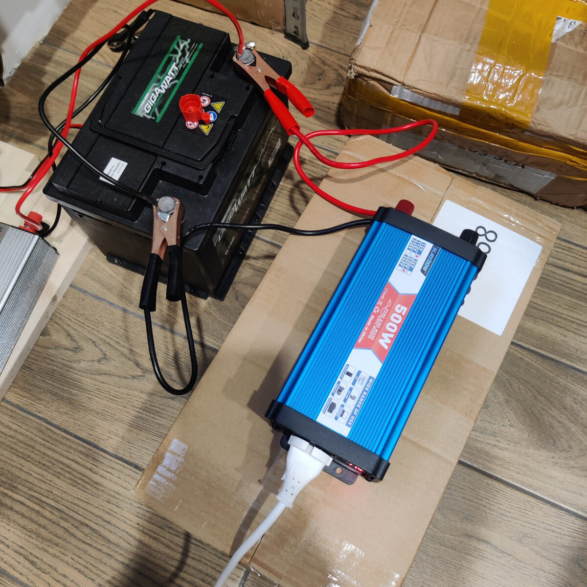 Высокочастотный инвертор в теплоотводящем корпусе мощностью 500 Ватт (пик до 1000 Ватт). Присутствует USB выход. Питание от аккумулятора или солнечной панели. Присутствует защита от короткого замыкания, перегруза, высокого и низкого напряжения, перегрева.