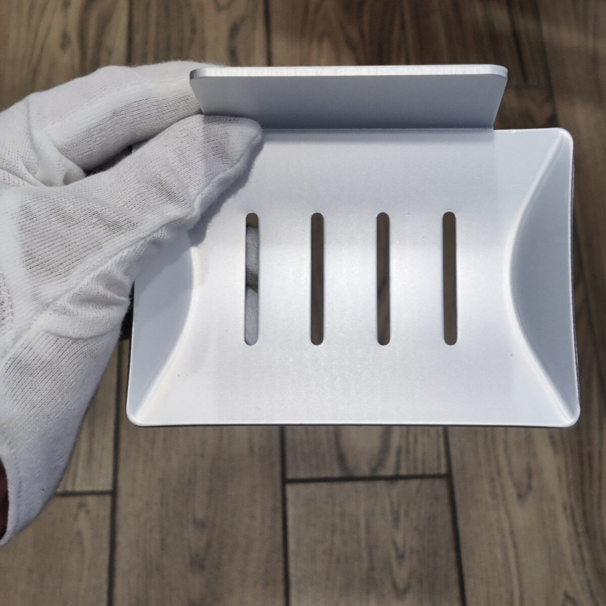 Мильниця з товстого алюмінію, жорстка та стильна. Виглядає набагато дорожче пластикових і мильниць з нержавіючої сталі. Не боїться корозії. Кріплення на стіну – клей.