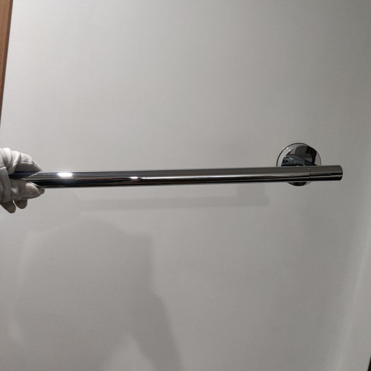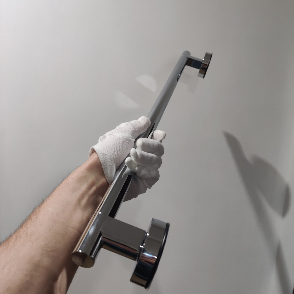 Вішалка для рушників у ванну із вакуумним кріпленням на стіну. Кріплення виготовлене з пластику, штанга для рушників - з алюмінію. Присоски приховані, це робить товар більш стильним та сучасним.
