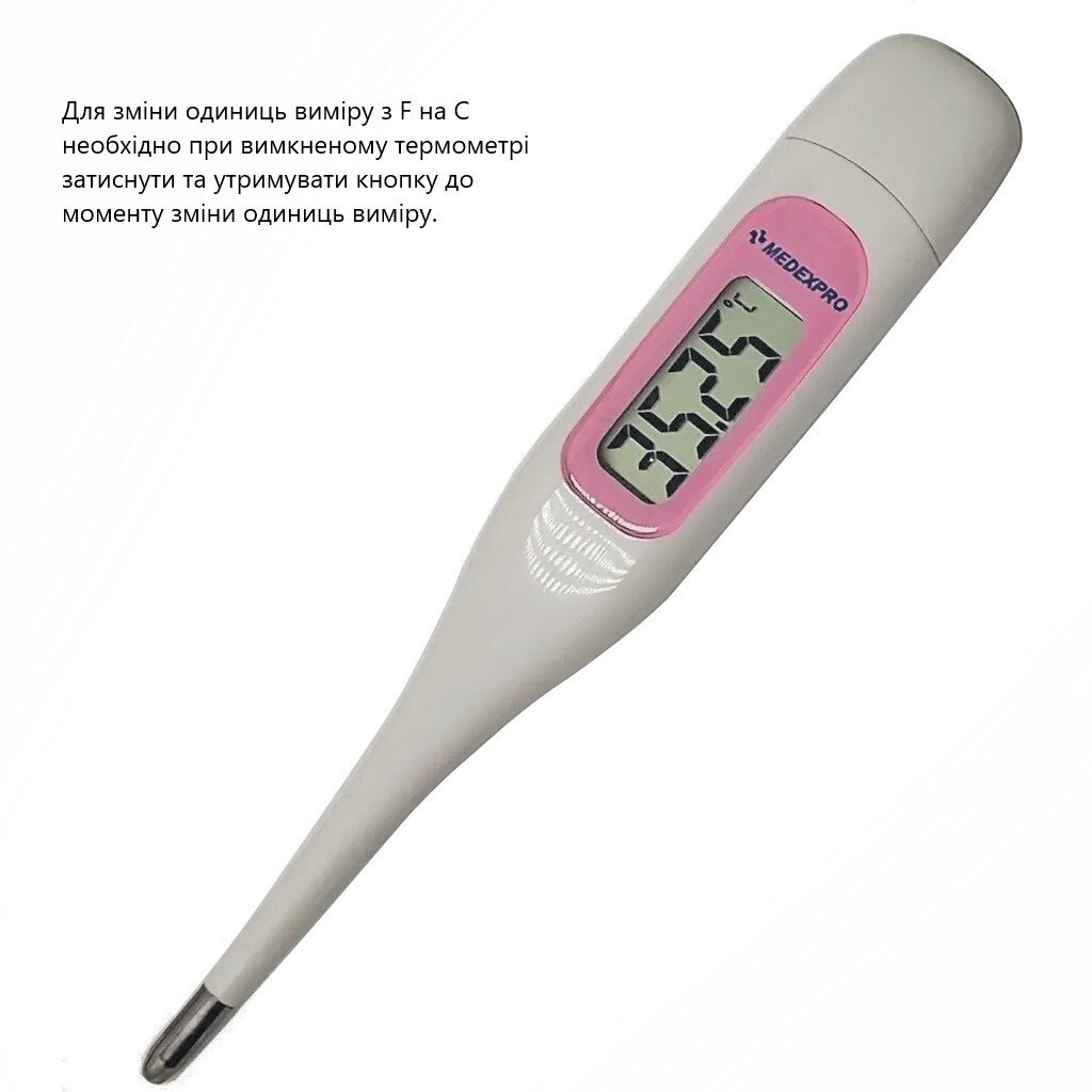Для зміни одиниць виміру з F на С необхідно при вимкненому термометрі затиснути та утримувати кнопку до моменту зміни одиниць виміру.