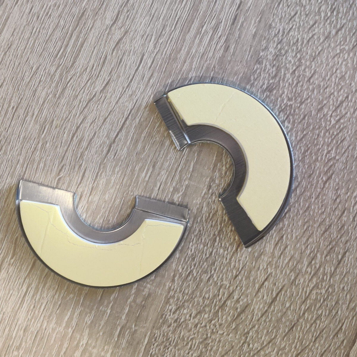 Декоративна накладна чашка із нержавіючої сталі. Складається з двох половинок, що дозволять обійти незнімні труби. Товщина 5 мм. Кріплення – липка 2-х стороння стрічка (у комплекті).