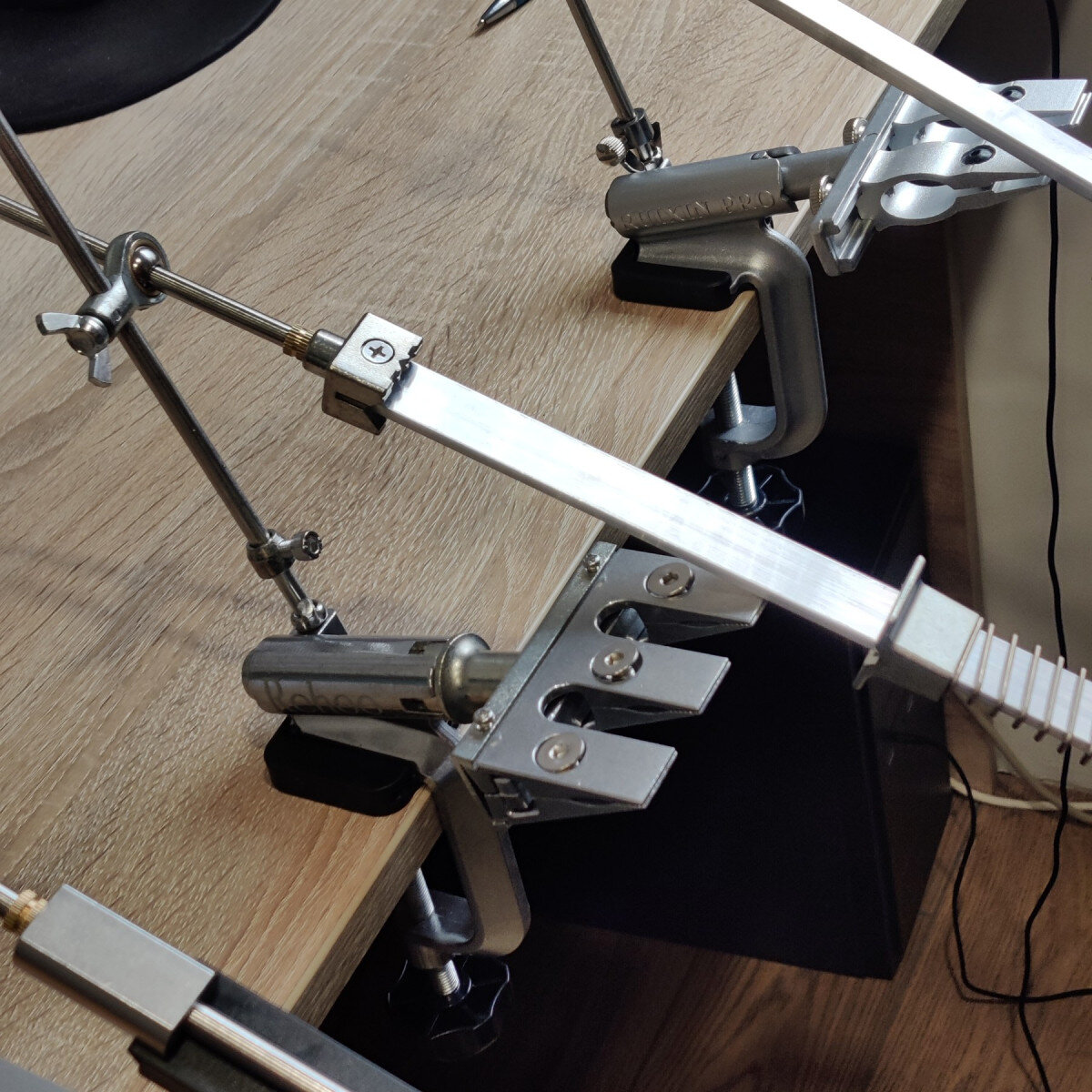 Точильний верстат для професійного заточування ножів. Товар об'єднаний поворотним шарніром та подвійним затискачем, що робить верстат максимально зручним та універсальним.