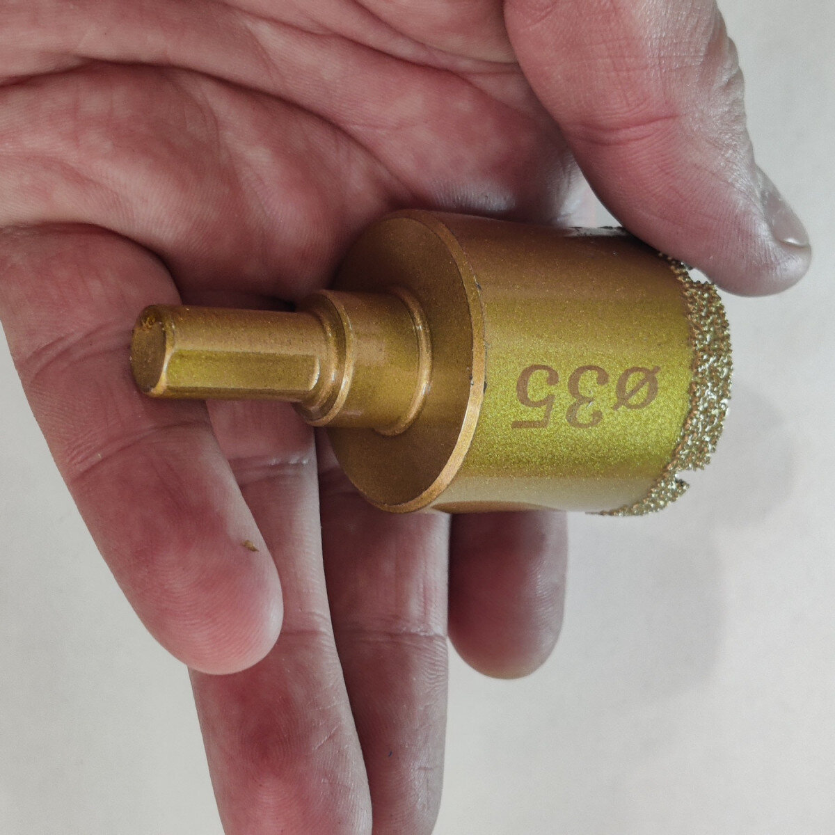 Усиленная коронка с алмазным покрытием. Крепление на дрель или шуруповерт. Легко справляется с прочными материалами.