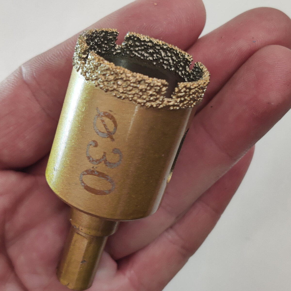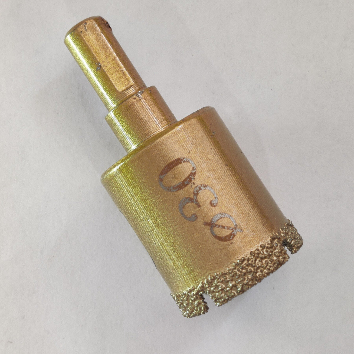 Усиленная коронка с алмазным покрытием. Крепление на дрель или шуруповерт. Легко справляется с прочными материалами.