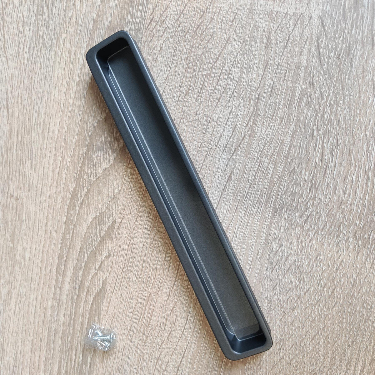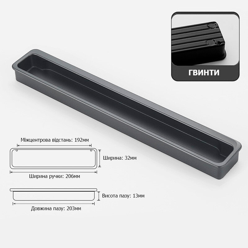 Меблева ручка з алюмінію призначена для врізної установки у фасади. Одночасно тонка, але досить широким отвором під пальці.