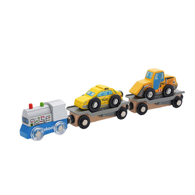Набір iekool IE-G4 — це яскравий дерев'яний комплект, що складається з паровозика, двох вагончиків, машинки таксі та навантажувача. Усі елементи виготовлені з натурального дерева, мають безпечне покриття та зручну форму для дитячих ручок.