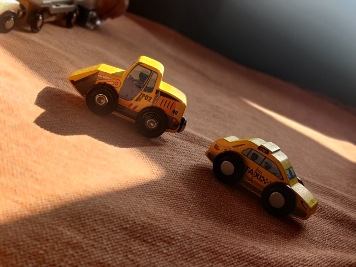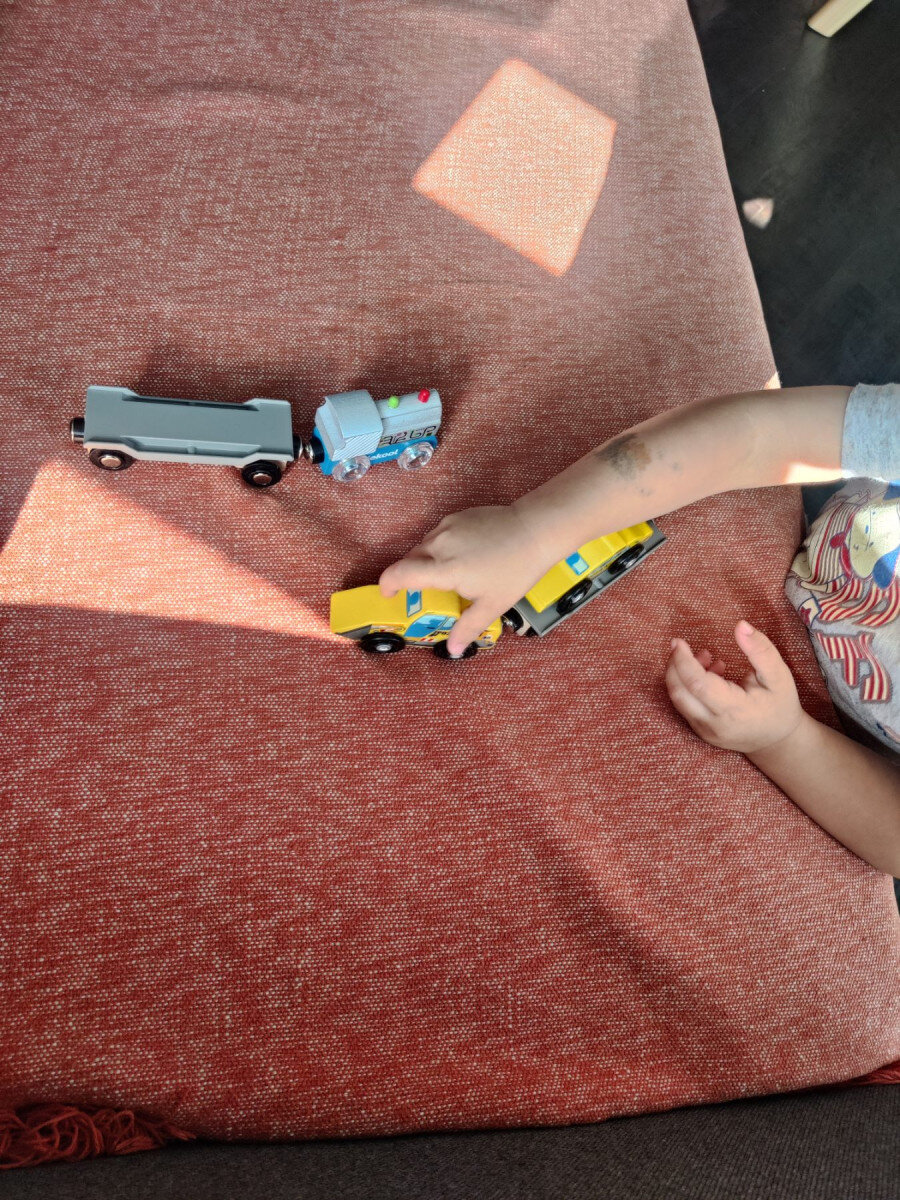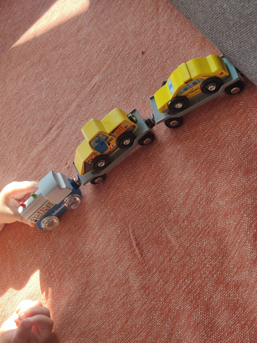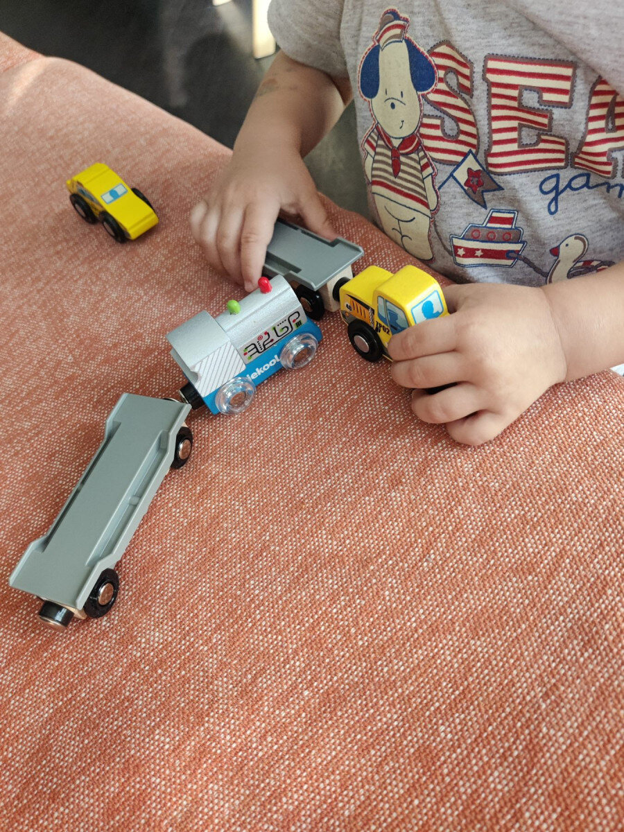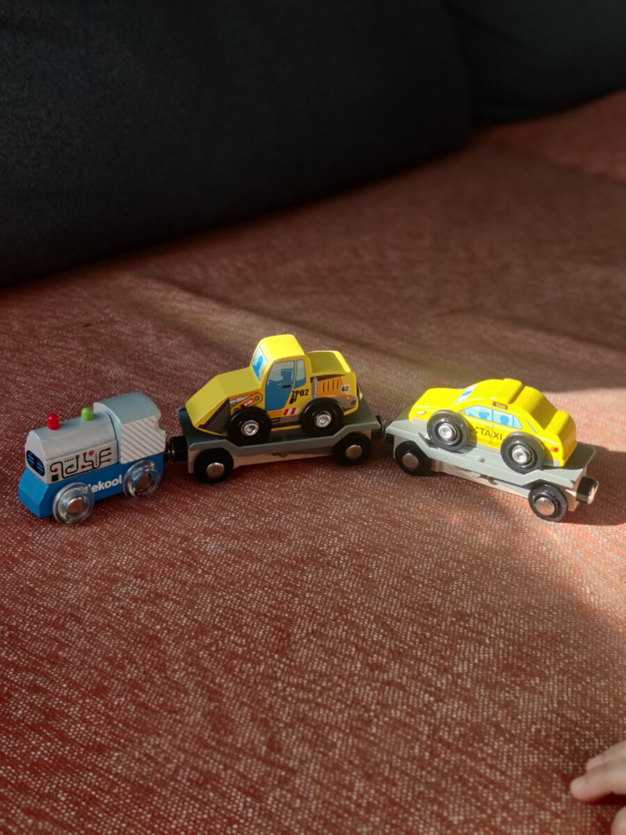 Паровозик і вагончики з'єднуються між собою магнітами та чудово підходять до більшості стандартних дерев’яних залізниць, а також можуть використовуватися окремо для вільної гри. Навантажувач із рухомим ковшем додає інтерактивності, а яскраве таксі відкриває нові сюжетні сценарії.