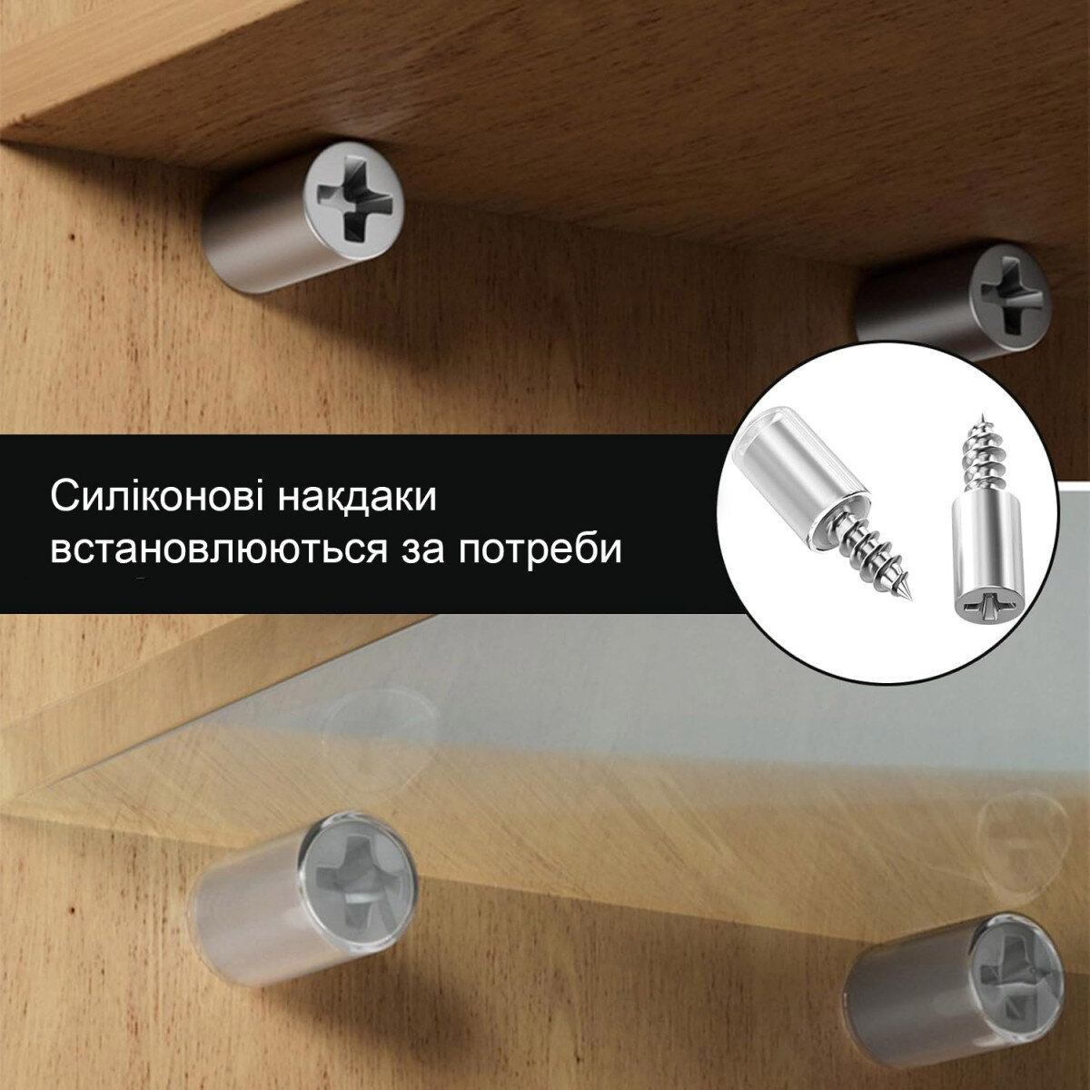У комплект входять прозорі силіконові накладки, які легко знімаються та використовуються при монтажі скляних полиць — вони захищають скло від подряпин і забезпечують щільне, м’яке прилягання.