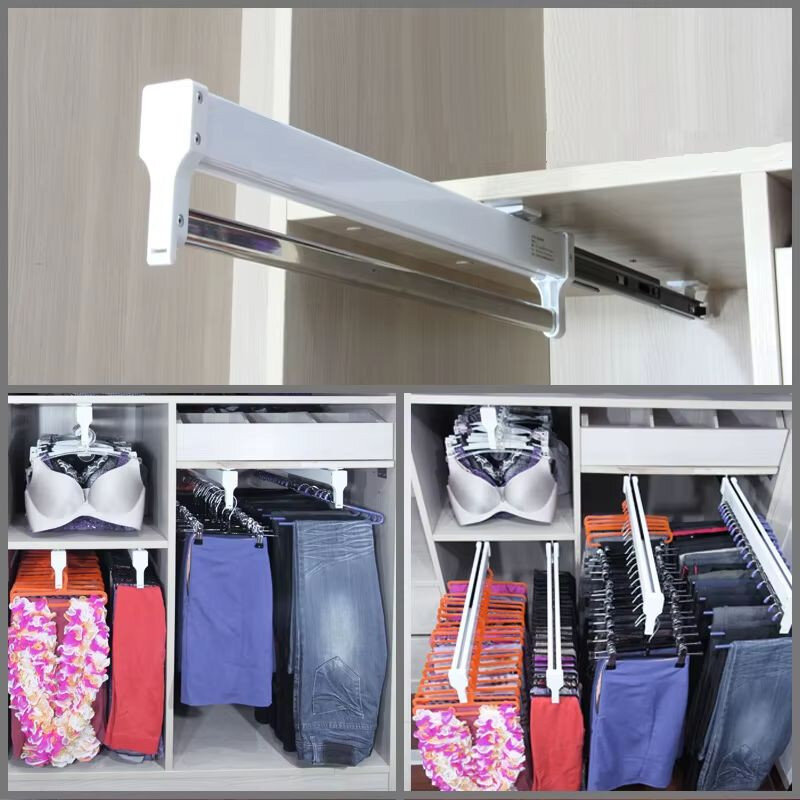 Висувна штанга-мікроліфт — це практичне та сучасне рішення для ефективної організації простору у шафі чи гардеробній. Завдяки телескопічному механізму повного висування забезпечує легкий доступ до речей навіть у найглибших нішах, що робить користування максимально зручним.