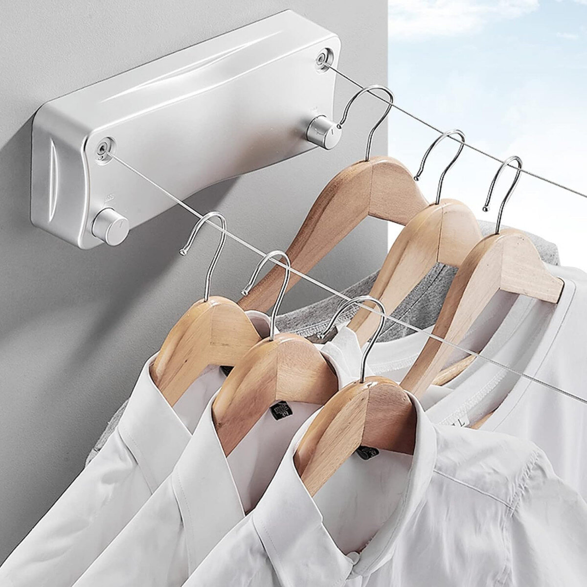 Автоматична мотузка для білизни використовується для сушіння білизни на балконі, у ванній кімнаті, на кухні або в будь-якому іншому зручному місці. Система має фіксатор, завдяки якому трос розтягується на потрібну відстань (максимум 5,2 метра).