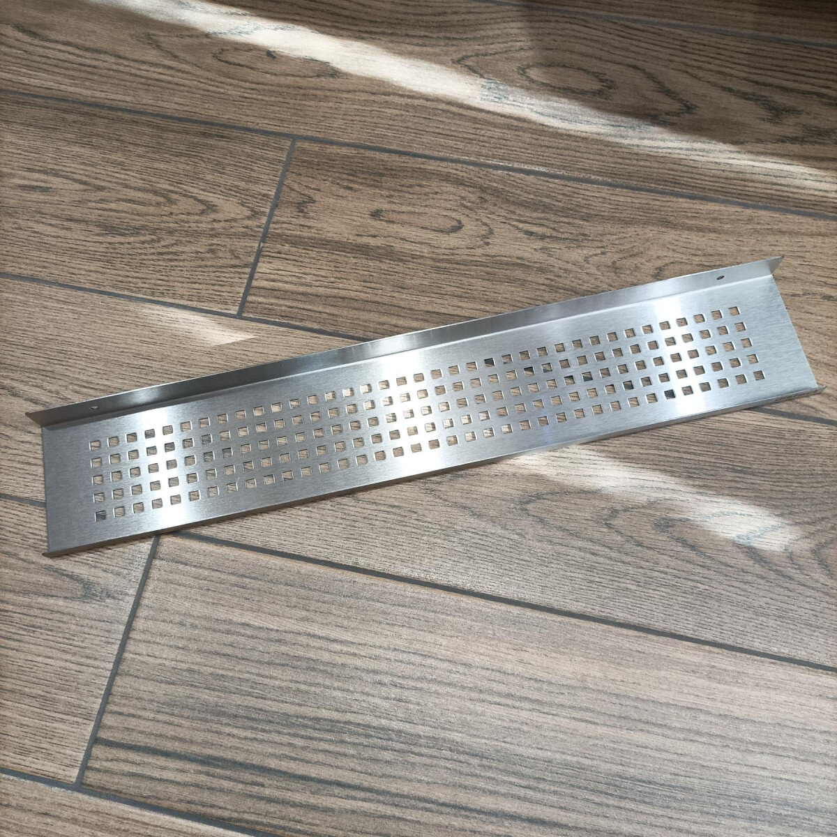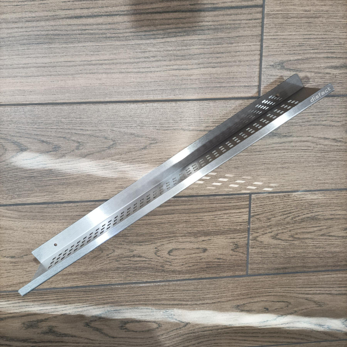 Поличка виготовлена з цільної товстостінної нержавіючої сталі 1 мм — вона впевнено тримає навантаження та не деформується в щоденному користуванні. Матове сріблясте покриття виглядає стримано й дорого, менше збирає сліди від пальців і легко очищується.