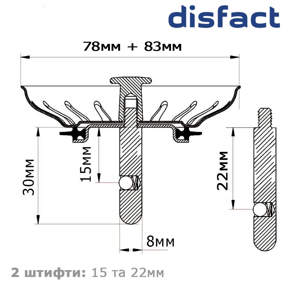 У комплекті передбачено одразу дві сітки популярних розмірів — 78 мм і 83 мм, а також два штифти діаметром 8 мм різної довжини. Це робить комплект більш універсальним і зручним у підборі для різних типів кухонних мийок. Додаткові кріпильні елементи та ущільнення допомагають швидко зібрати комплект і встановити його без зайвих складнощів.