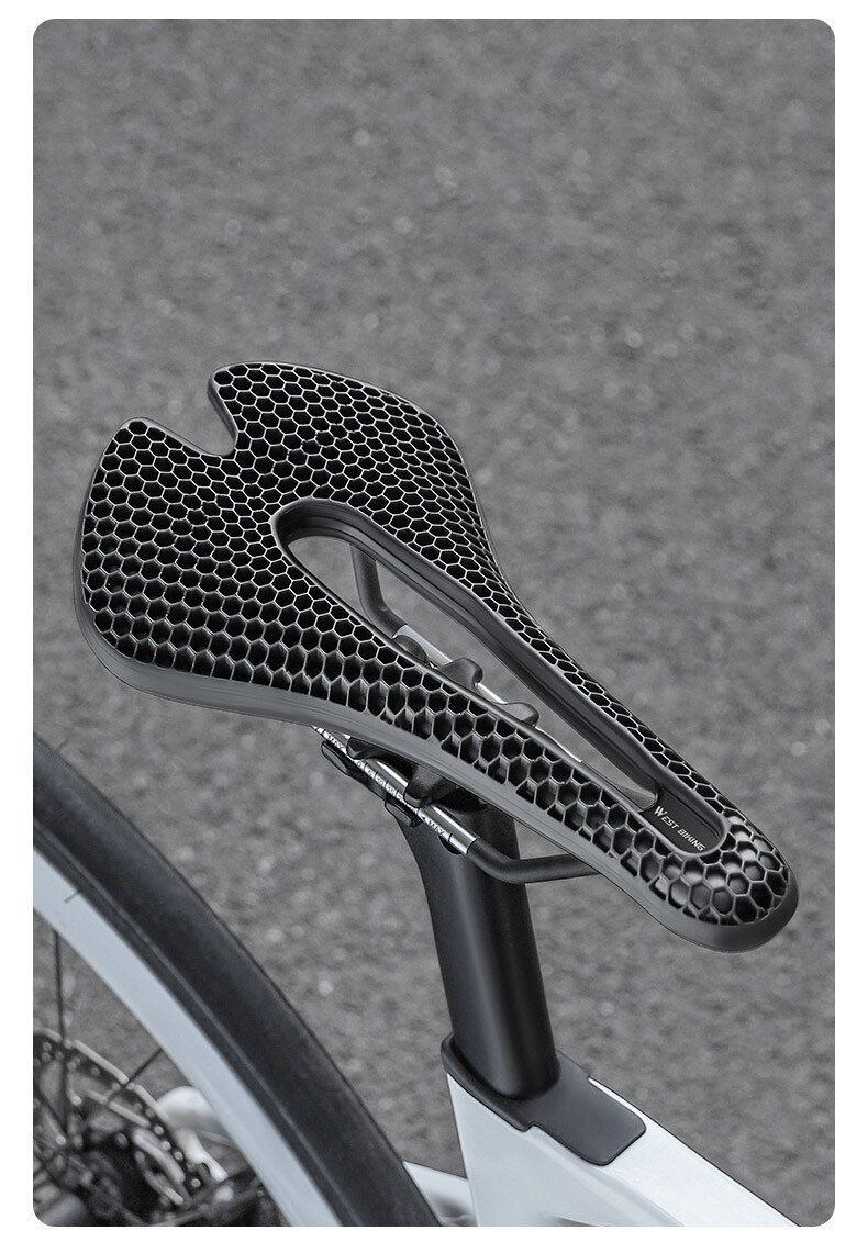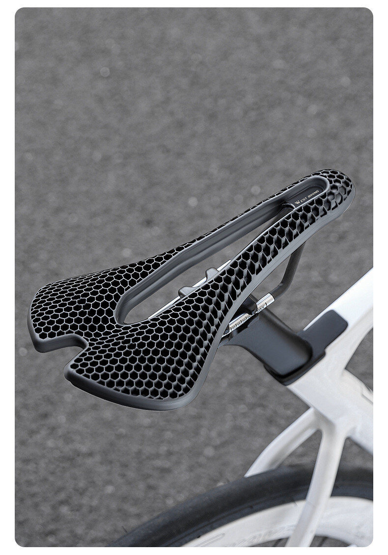 Сучасне велосипедне сідло зі стільниковою 3D-структурою забезпечує комфорт під час тривалих поїздок. Поверхня виконана у вигляді об'ємної комірчастої сітки, яка покращує вентиляцію, зменшує нагрівання та допомагає рівномірно розподіляти навантаження.