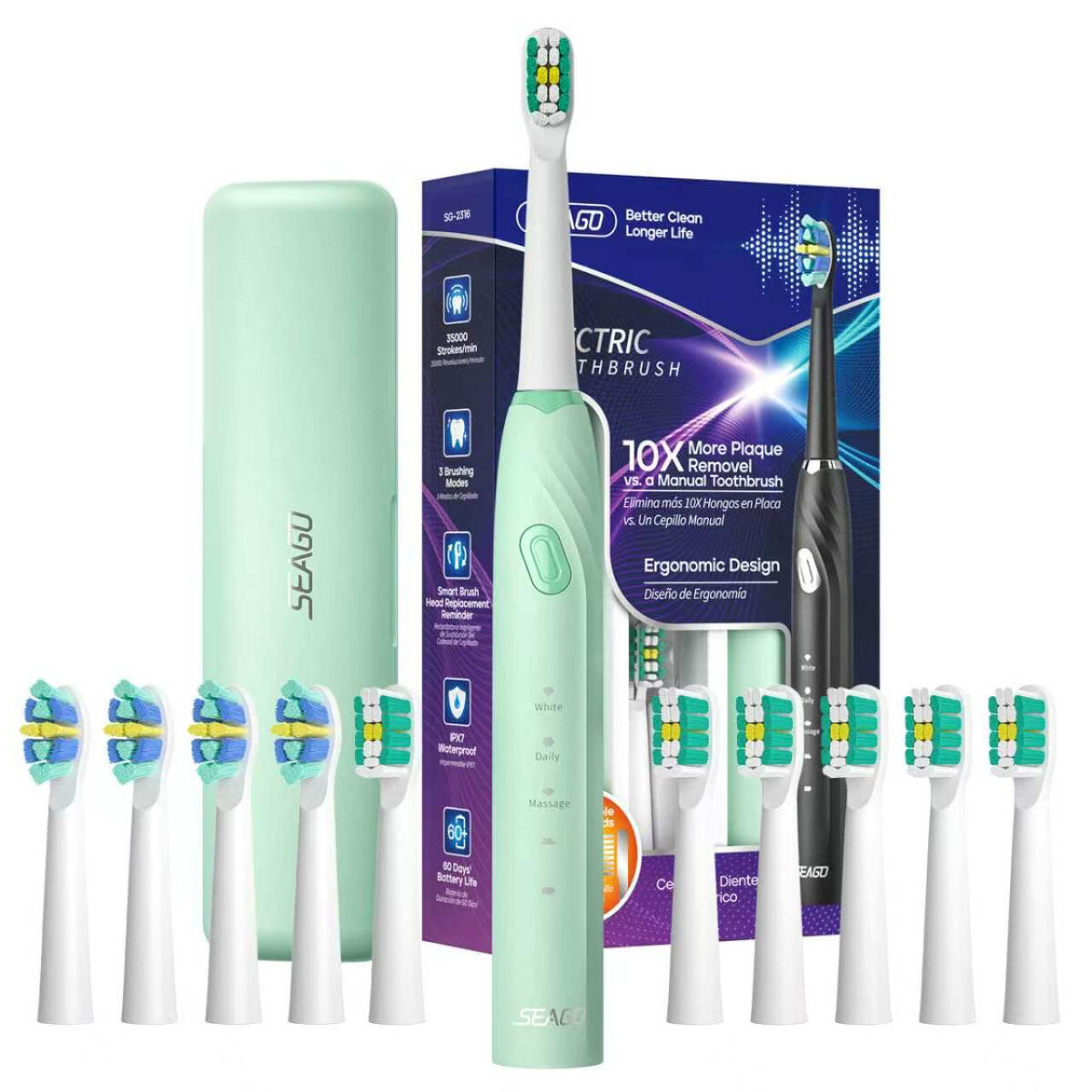 Електрична зубна щітка SEAGO SG-2316 створена для щоденного комфортного догляду за зубами та яснами. Модель поєднує ергономічний дизайн, ефективне звукове очищення, швидке заряджання через Type-C та розширену комплектацію з великим запасом змінних насадок.