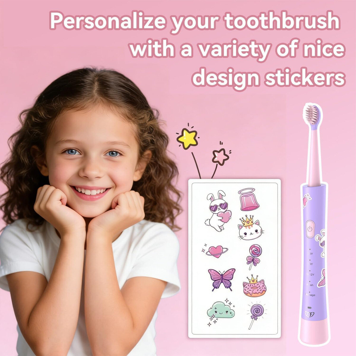 Щітка має яскравий дизайн і комплект декоративних наклейок, що дозволяє дитині персоналізувати пристрій. Це підвищує зацікавленість та робить процес чищення зубів більш приємним і регулярним. :contentReference[oaicite:5]{index=5}