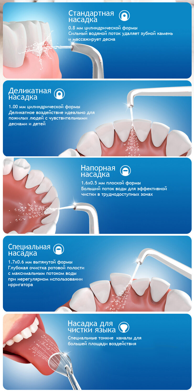 У комплекті з іригатором йдуть 5 насадок: