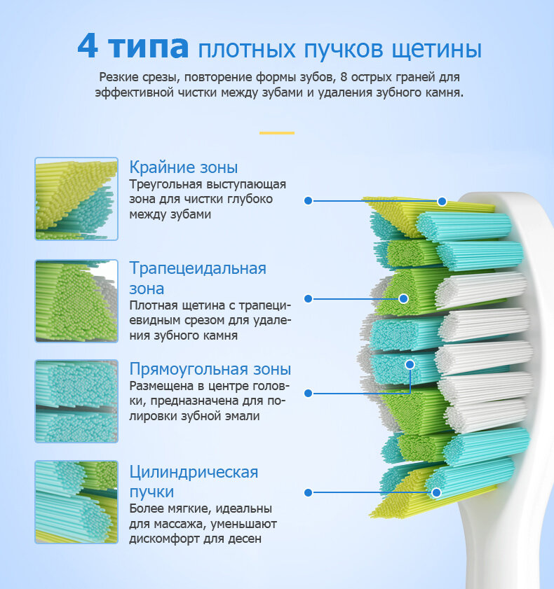 Щетина насадки виконана з матеріалу американської компанії DuPont і ділиться на 7 зон. Волосинки середньої і високої жорсткості.