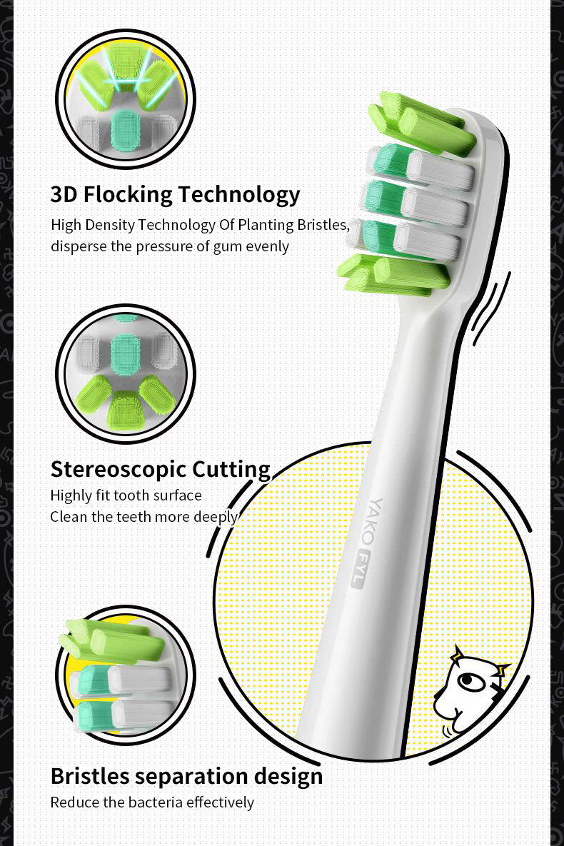 Сменные насадки для зубных щеток YAKO K1, O1 и Lebond ELEC. Головка со щетины американского производства с плотными пучками в центре. Хорошее удаление зубного налета и деликатный контакт с деснами.