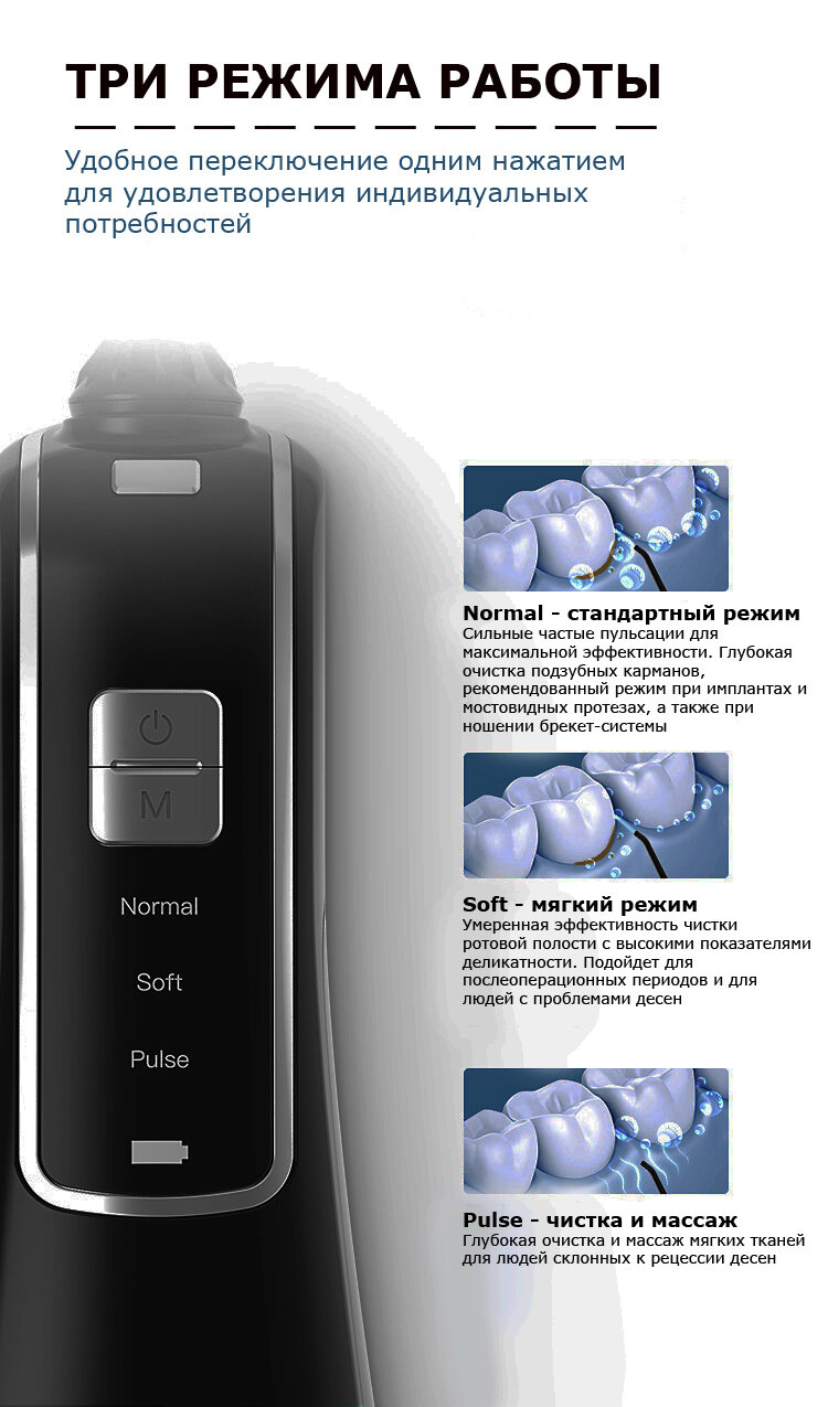 Soft - м'який режим. Помірна ефективність чищення ротової порожнини з високими показниками делікатності. Підійде для післяопераційних періодів і для людей з проблемами ясен.
