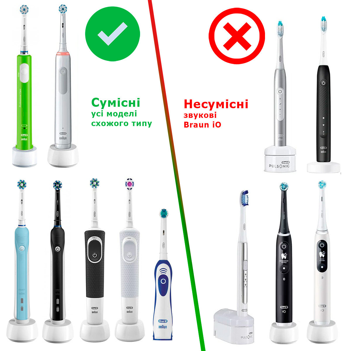 Список сумісності: Vitality Precision Clean, Vitality Dual Clean, Vitality 3D, Genius, DB4, PRO / Professional, Professional Care SmartSeries, TriZone, Advance power, Pro Health, Triumph, 3D Excel, Plak Control 3D / Duo, Triumph Professional Care, Triumph, Sensitive Clean , White Clean, Interclean, Pro-Health, D4510, D12013, D12013W, D12523, D17525, D18, D19523, D19545, D20523, D20545, OC18, D8011, D9525, D9511, D20, D25, D30, D32, 4739, 3709, 3728, 3738, 3744, 3757, 4731, 4728, 4739, 3709, 3728, 3738, 1000, 3000, 5000, 8000, 8850, 8900. Виняток - звукові зубні щітки.