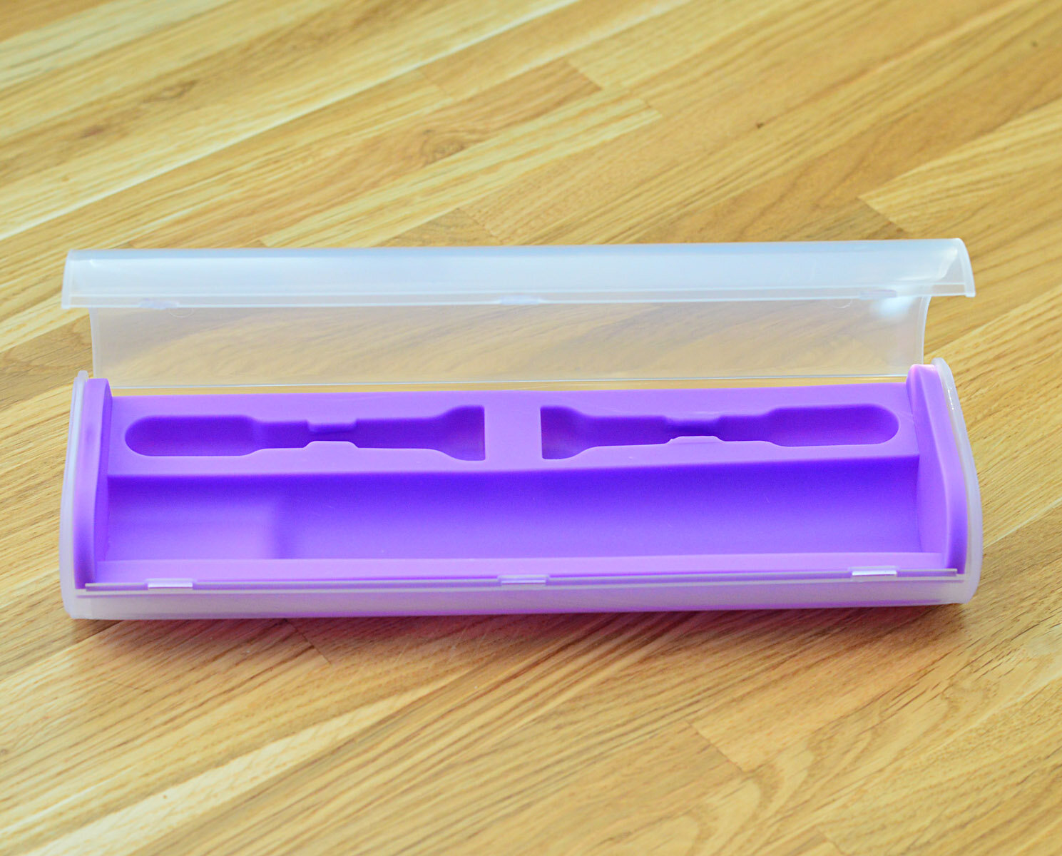 Футляр в передней части имеет уменьшенную глубину, это позволяет щетке лежать более плотно, данная форма идеально подходит для "изогнутых" электрических зубных щеток, которые выпускаются компанией Lebond. Данные зубные щетки более удобные в использовании, но подобрать для них дорожный бокс сложнее.