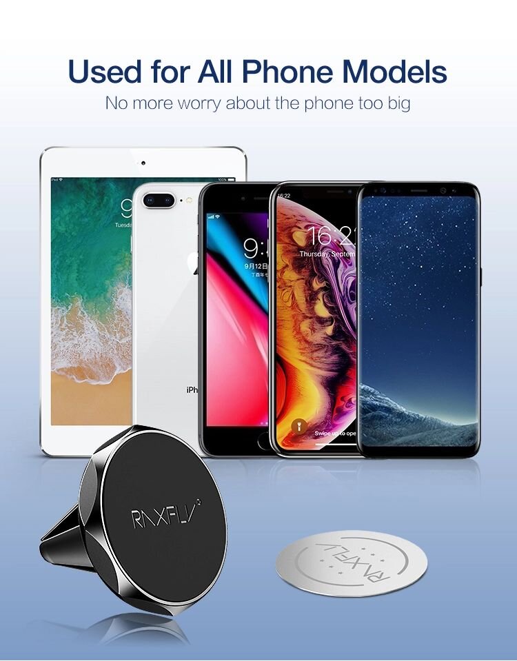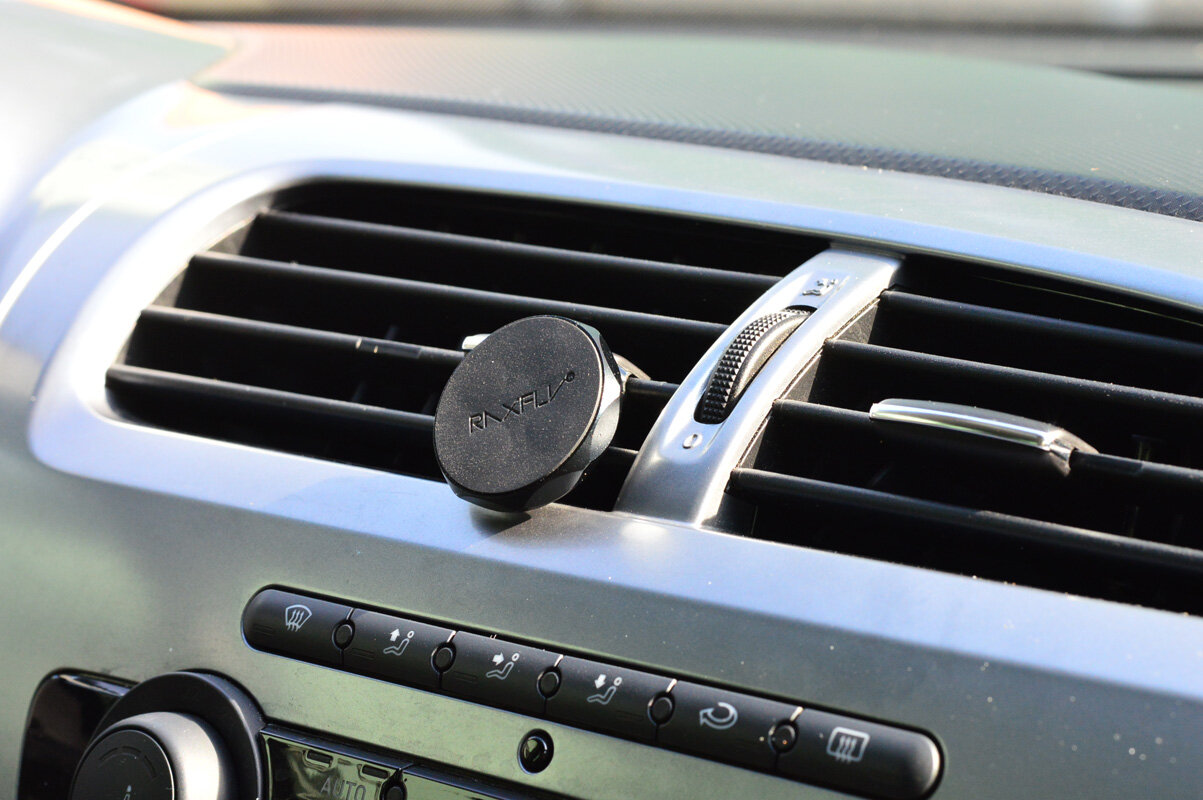 Держатель для телефона RAXFLY крепится на дефлектор с помощью металлической пружины, снаружи которой находится силиконовое покрытие. Такой крепеж не «разбалтывается» со временем, легко устанавливается и снимается. Держатель изготовлен из металла, содержит 4 мощных магнита. По качеству материалов и дизайну подойдет для «очень дорогого» автомобиля.