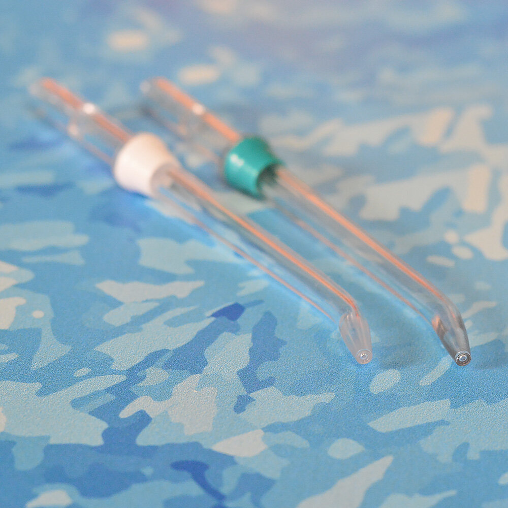 сопло діаметром 0.7мм ідеально підходить для видалення залишків їжі з брекетів і міжзубних проміжків. Призначено винятково для здорових ясен. А насадка з діаметром вихідного отвору 0.8мм рекомендована для промивання подзубних кишень (мостовидні протези, імпланти, пародонтит).