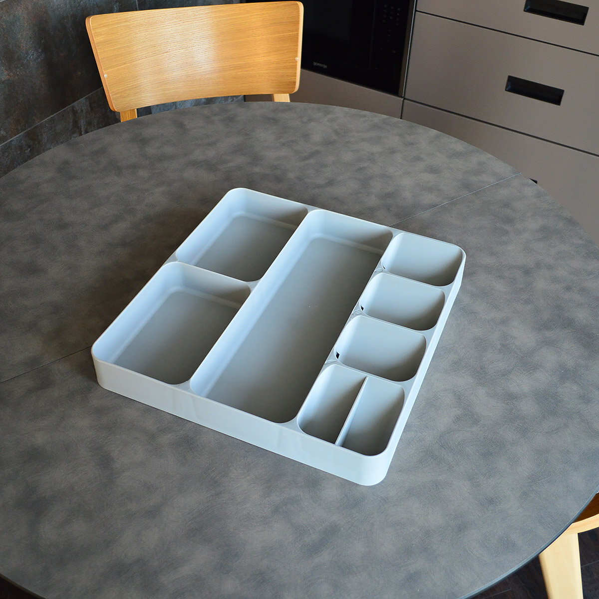 Лоток допоможе впорядкувати вилки, ложки, ножі та інший кухонний інвентар. Виріб складається з восьми секцій, у яких можна зберігати різні кухонні інструменти. Кожне з відділень має спеціальне позначення, і ви завжди знатимете в якому відділенні який прилад лежить. Рекомендується мити лише вручну.
