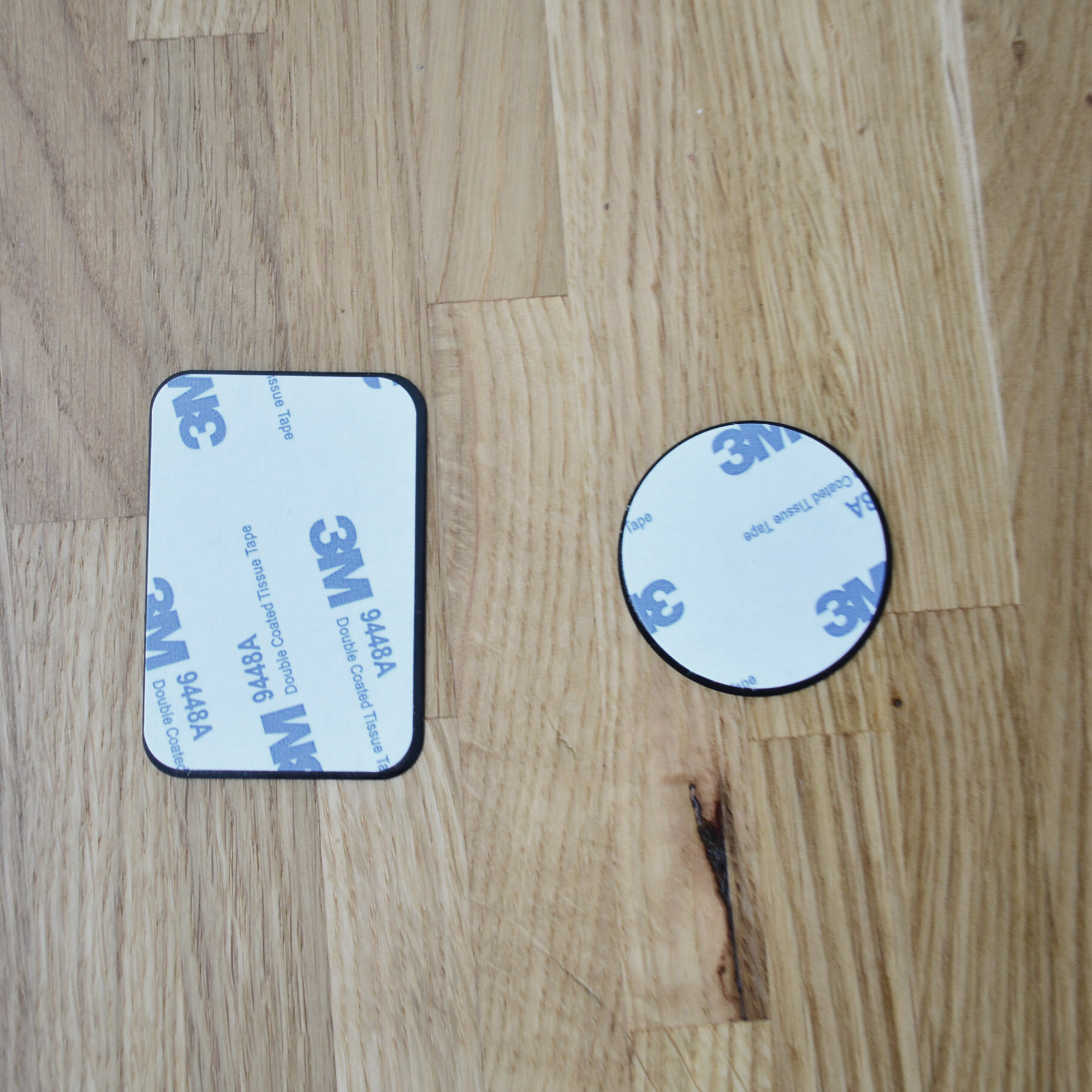 На телефон кріпиться металева пластина, в комплекті їх 2 шт. Кругла для стандартного утримання, прямокутна - для посиленого. Пластини чорного кольору, з одного боку мають клейку покриття 3М.