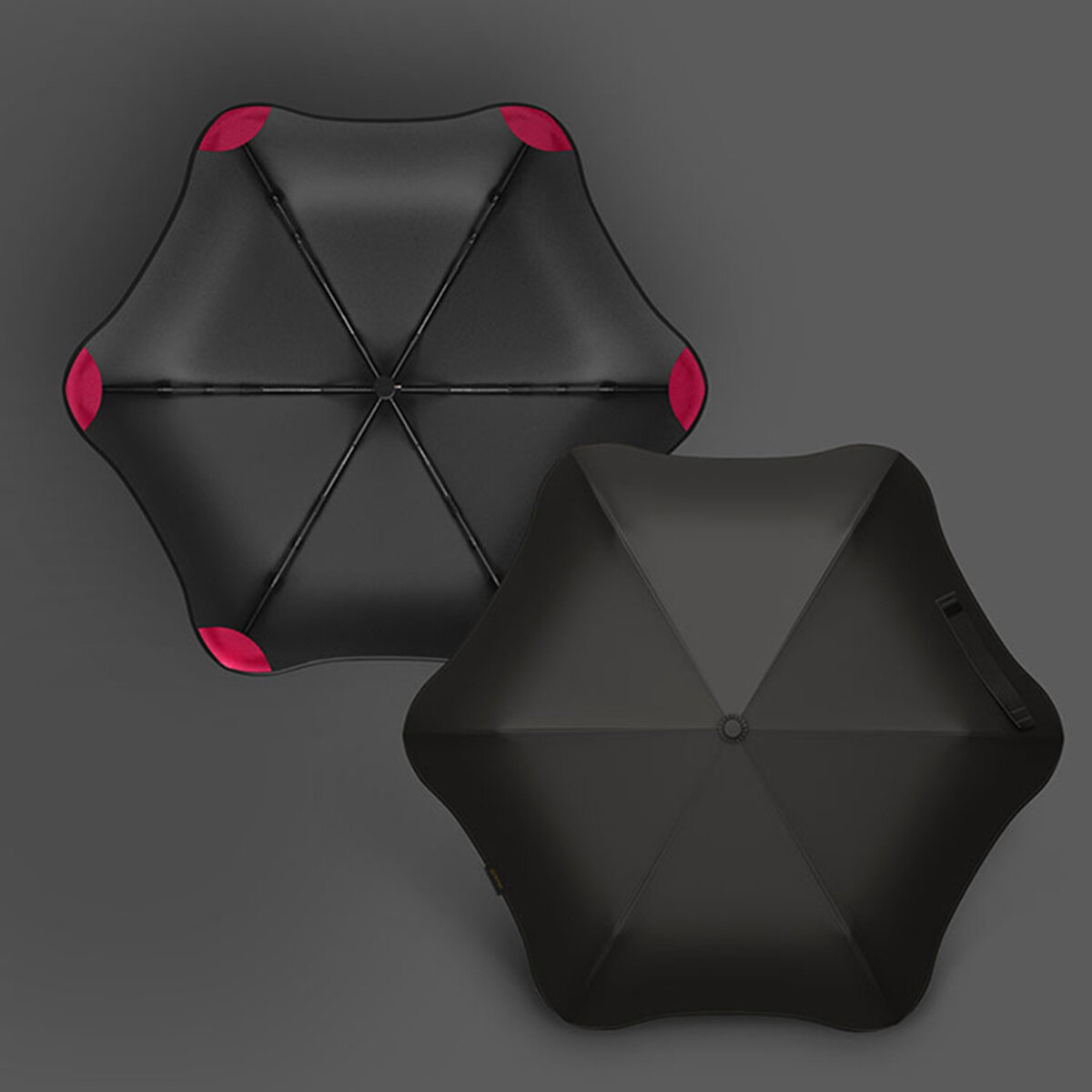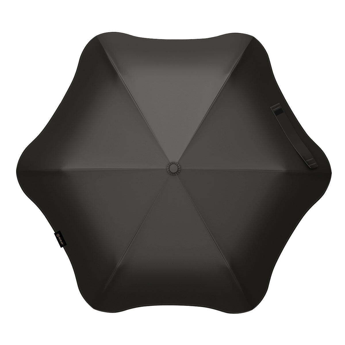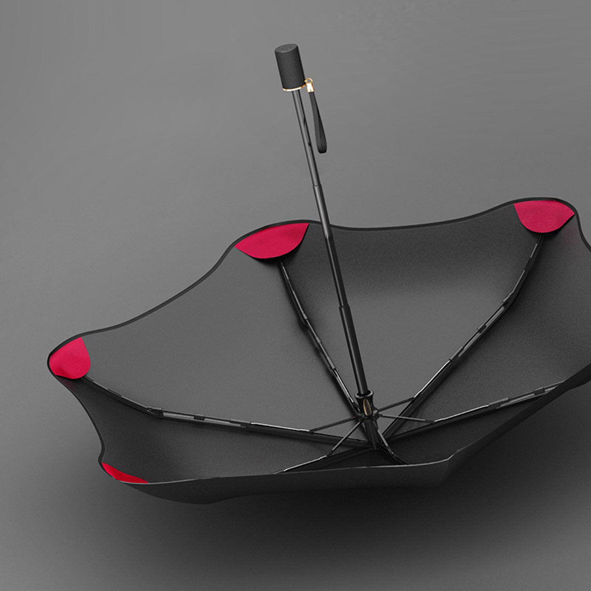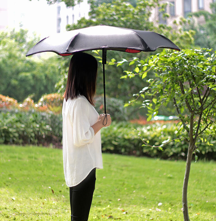 Стильный зонт с особой формой купола, изготовлен из алюминия. Простой надежный механизм раскрывания.
