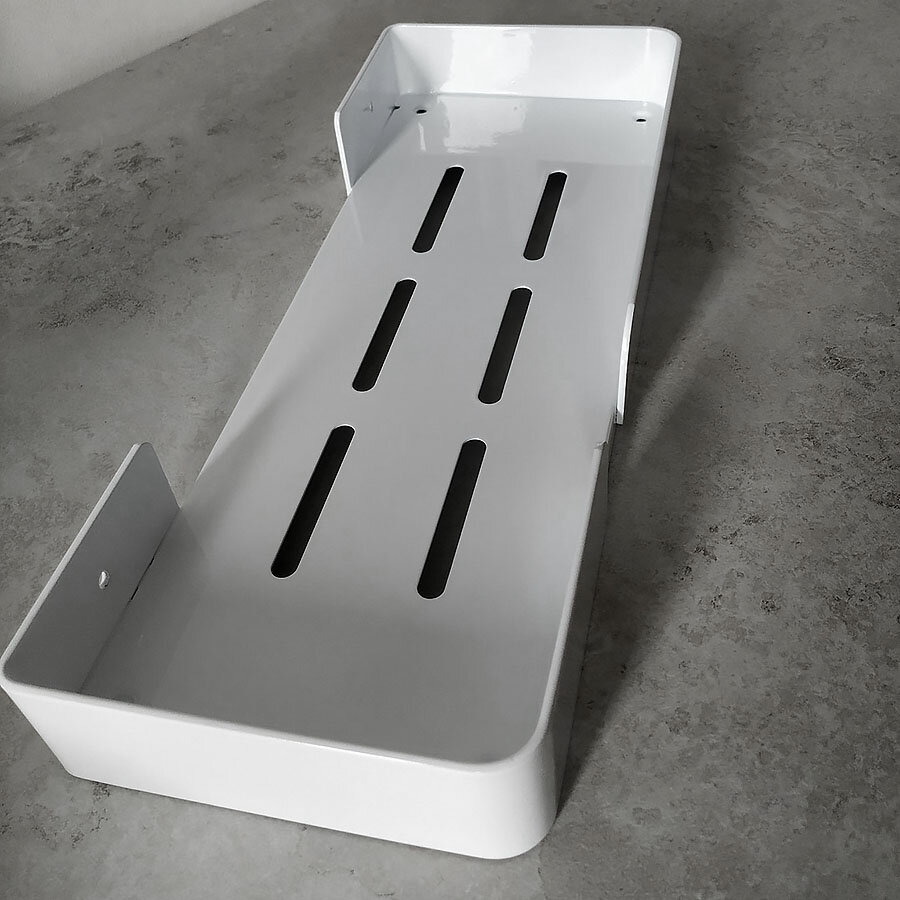 Полиця для ванної виготовлена з алюмінію, стійка до дії вологи, не іржавіє. Полиця має сучасний дизайн (модерн, лофт), що гармонійно поєднується з більшістю дизайнерських рішень при облаштуванні ванної кімнати. Покриття – міцний ґрунт + фарба.