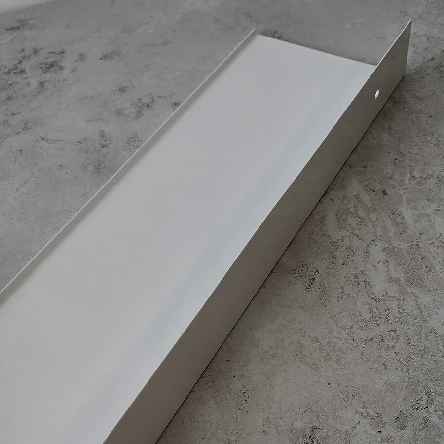 Полка для ванной из алюминия. Полка может крепиться обычно и наоборот (в зависимости от дизайнерских предпочтений), гармонично сочетается с большинством дизайнерских решений при обустройстве ванной комнаты. Прорези - отсутствуют, поверхность плоская. Дизайнерская линейка полок от IwConcept. Покрытие - прочный грунт + белая глянцевая краска.