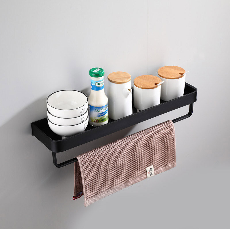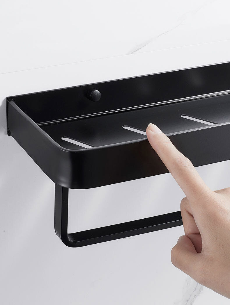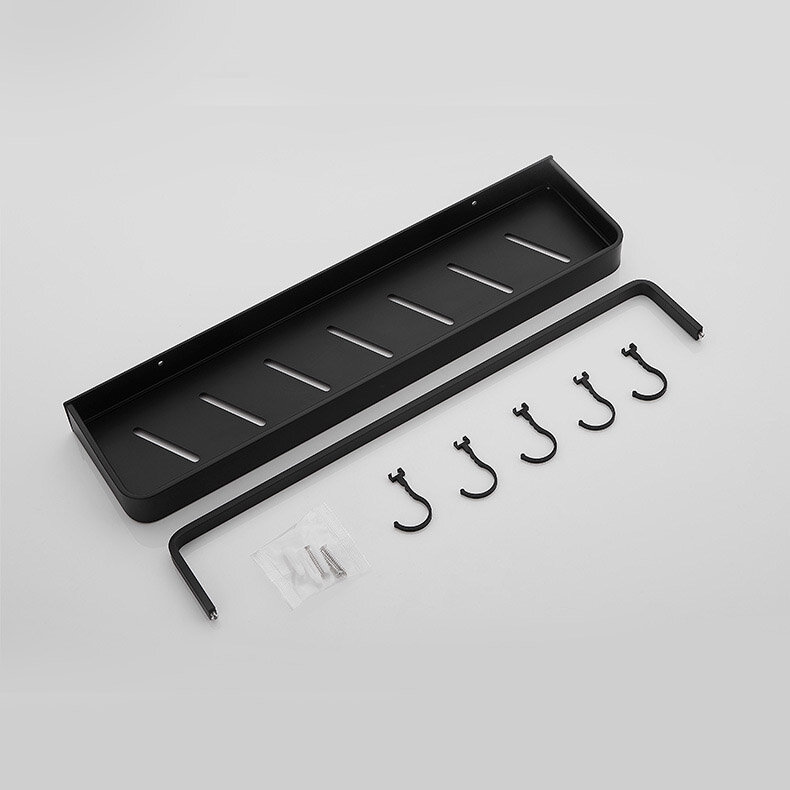 Полиця для ванної виготовлена з алюмінію, стійка до дії вологи, не іржавіє. Внизу кріпляться гачки та вішалка. Полиця має сучасний дизайн (модерн, лофт), що гармонійно поєднується з більшістю дизайнерських рішень при облаштуванні ванної кімнати. Покриття – фарба.