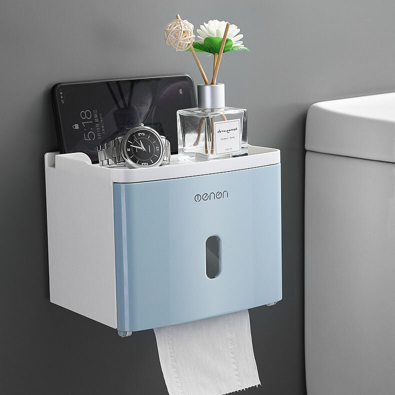 Сучасний і зручний тримач, що клеїться, виготовлений з удароміцного ABS пластику білого кольору з блакитною вставкою. Аксесуар має відділення для рулонного туалетного паперу, а також висувну скриньку та слот для гаджетів. Тримач також можна заправляти серветками. Аксесуар не боїться води та захищає ваші речі від вологи. Витримує вагу до 2.5 кілограмів і кріпиться на рівну гладку поверхню за допомогою самоклеючої пластини, яка йде в комплекті. Вам не доведеться свердлити стіни.