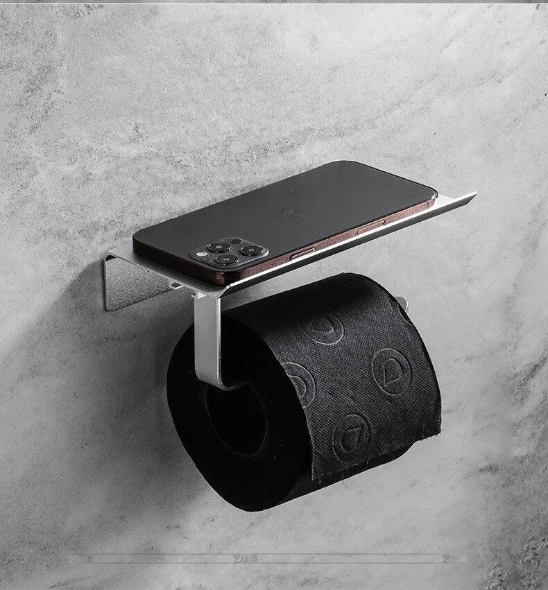 Тримач для туалетного паперу із алюмінію. Не боїться корозії. Надійне кріплення за допомогою шурупів чи клею (клей не йде в комплекті). Зверху є поличка.