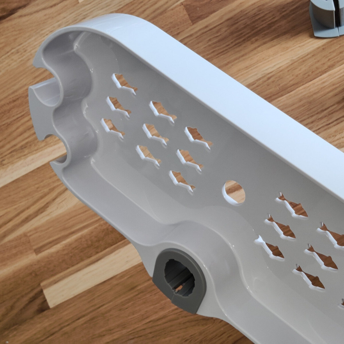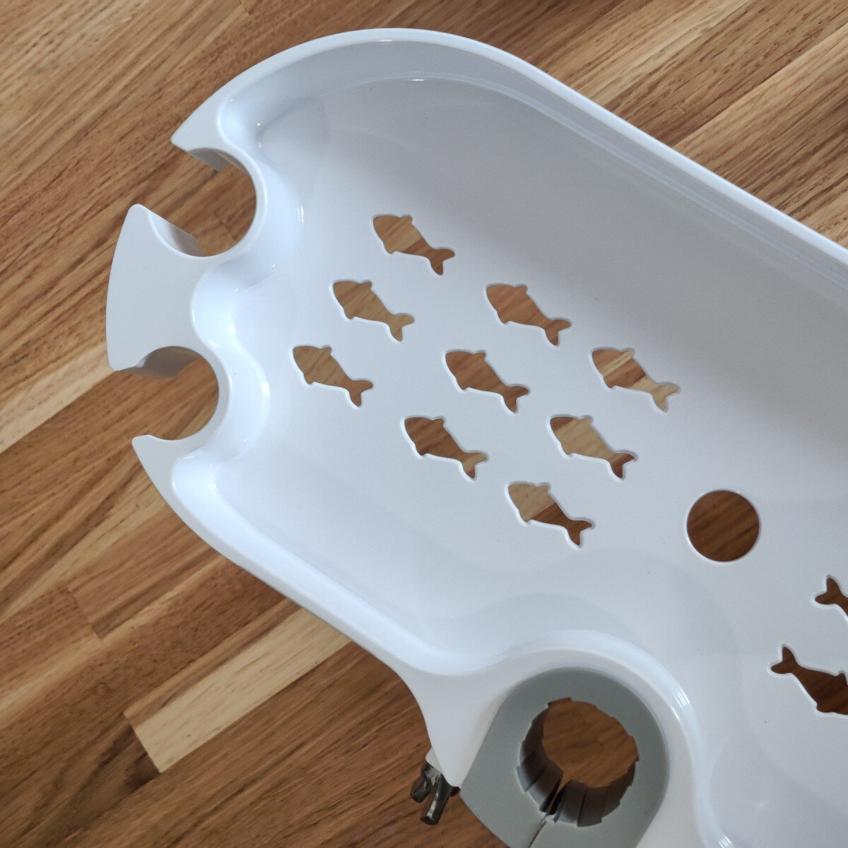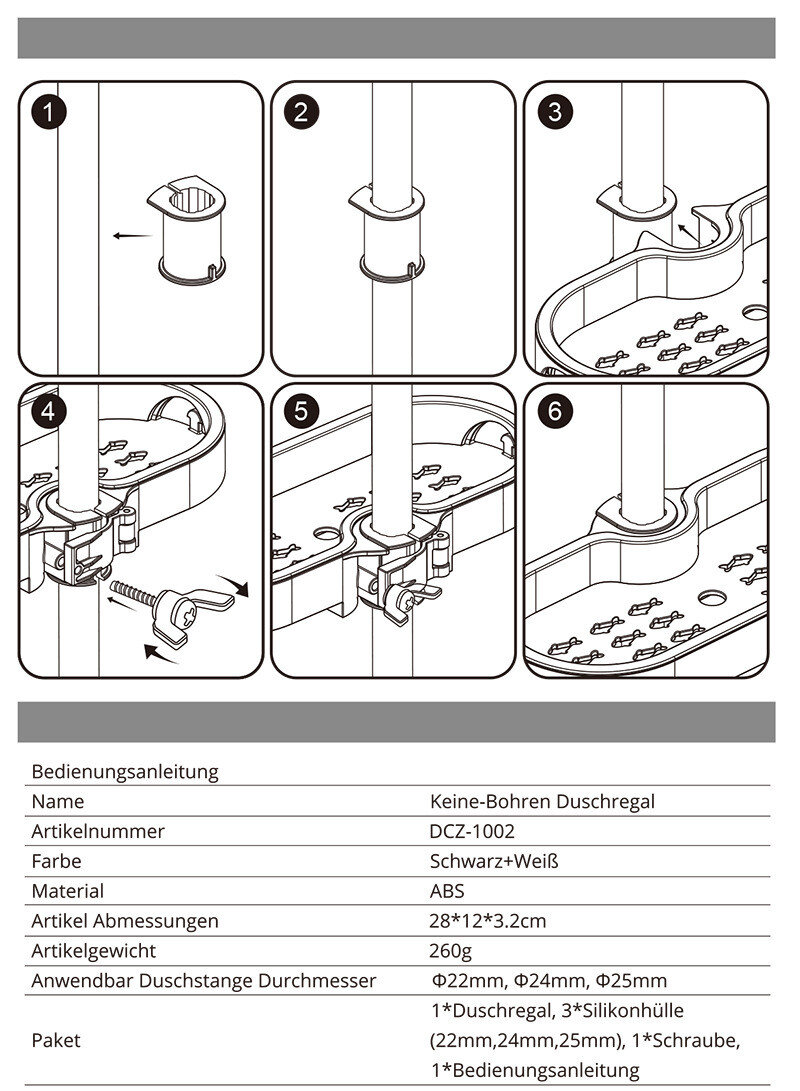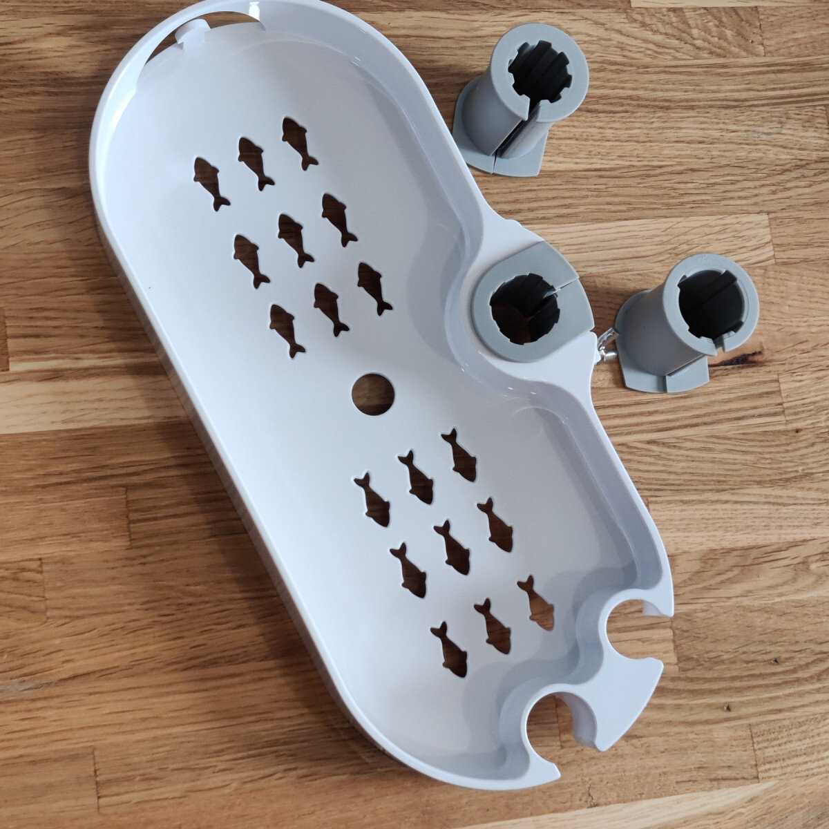 Полиця на душову стійку, виготовлена із пластику. Має гачки та місце для душової лійки.