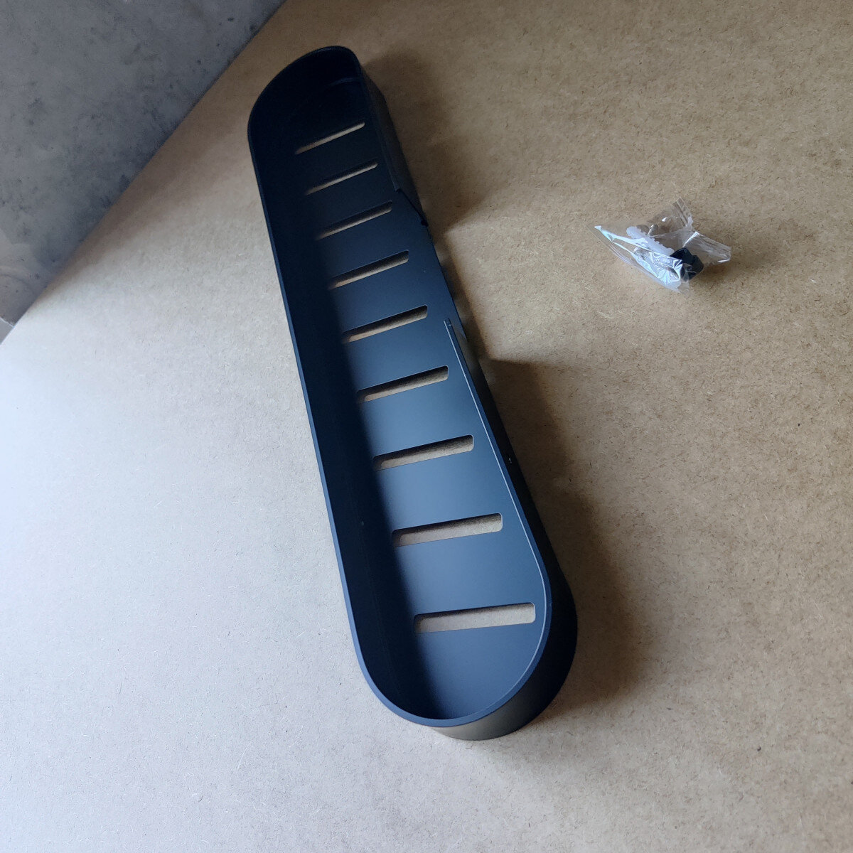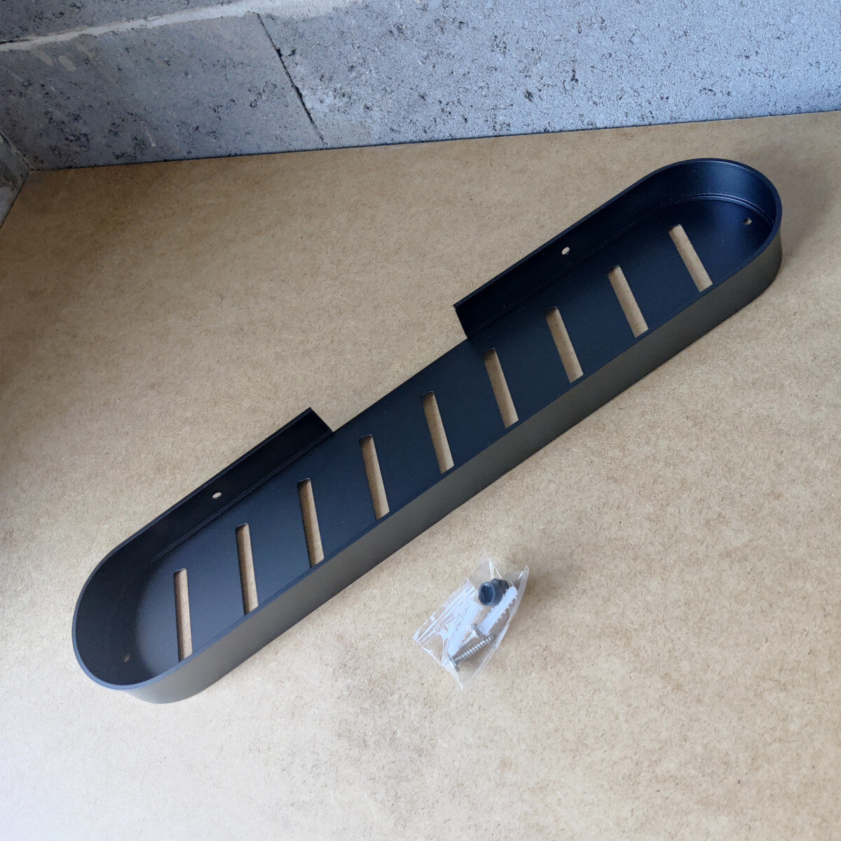 Полиця для ванної виготовлена з алюмінію, стійка до дії вологи, не іржавіє. Полиця має сучасний дизайн (модерн, лофт), що гармонійно поєднується з більшістю дизайнерських рішень при облаштуванні ванної кімнати. Покриття - надміцний ґрунт + чорна фарба.