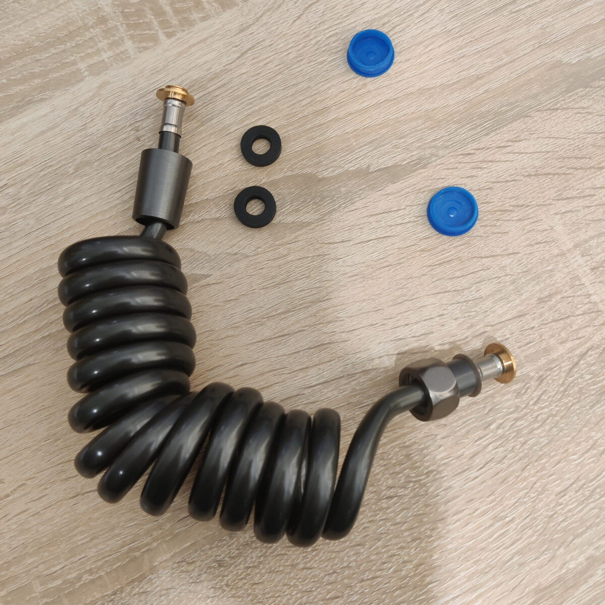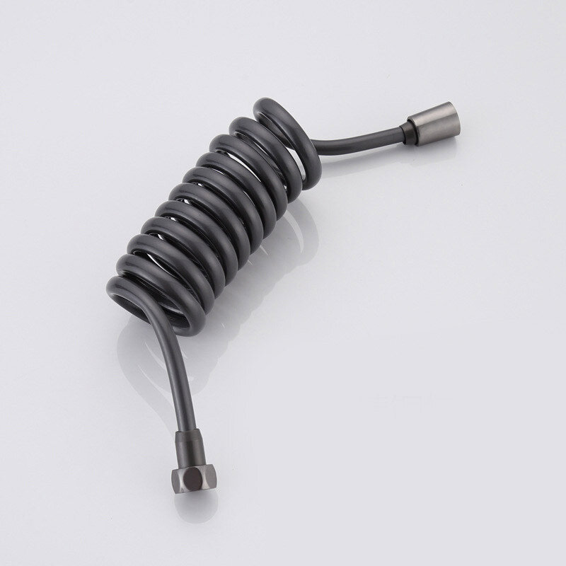 Шланг для гігієнічного душу (бідетти) спіральної форми. Не займає багато місця, після витягування повертається до попереднього положення. Гайки підключення на 1/2 дюйма, виготовлені з мідного сплаву, кріплення з нержавіючої сталі. Є ущільнюючі прокладки.