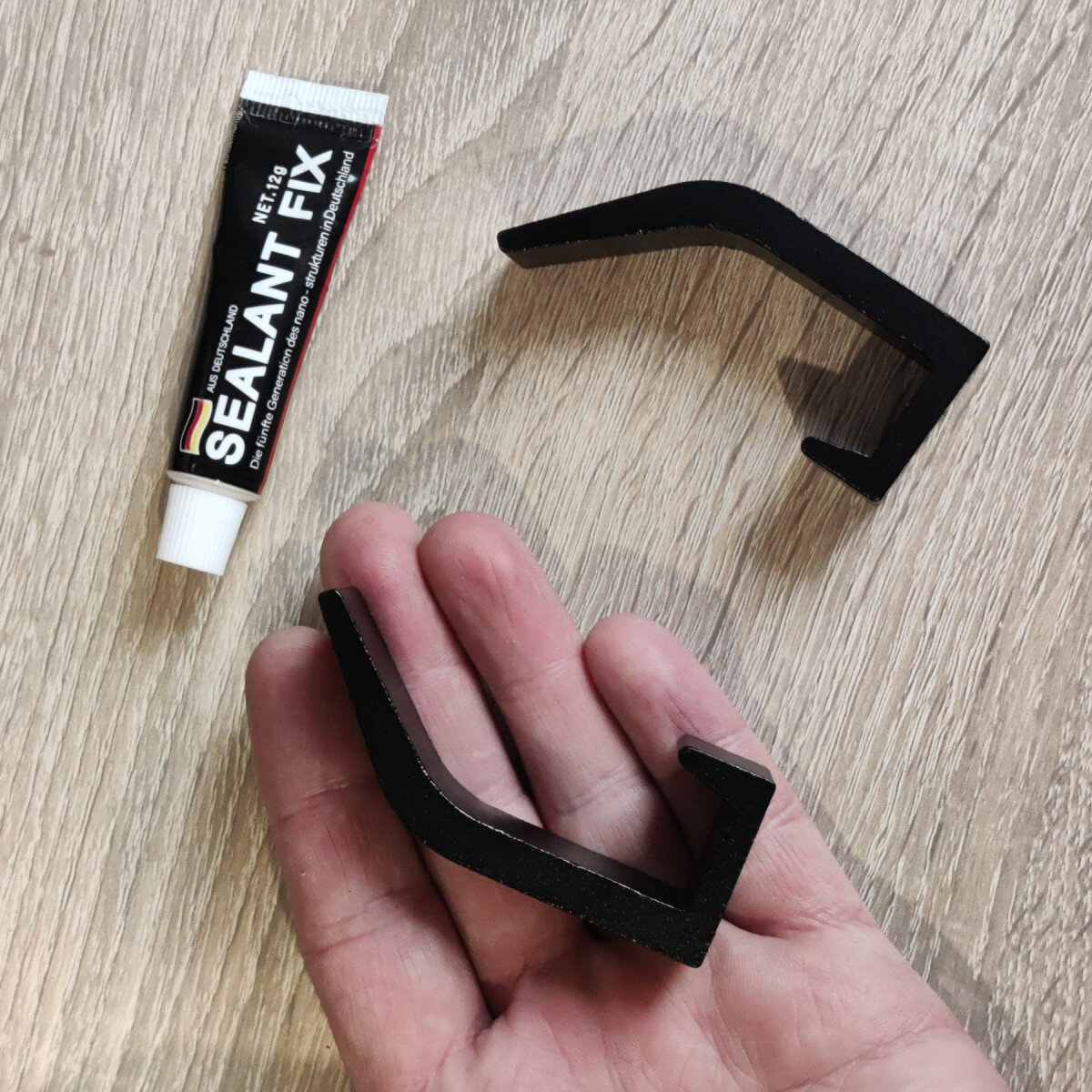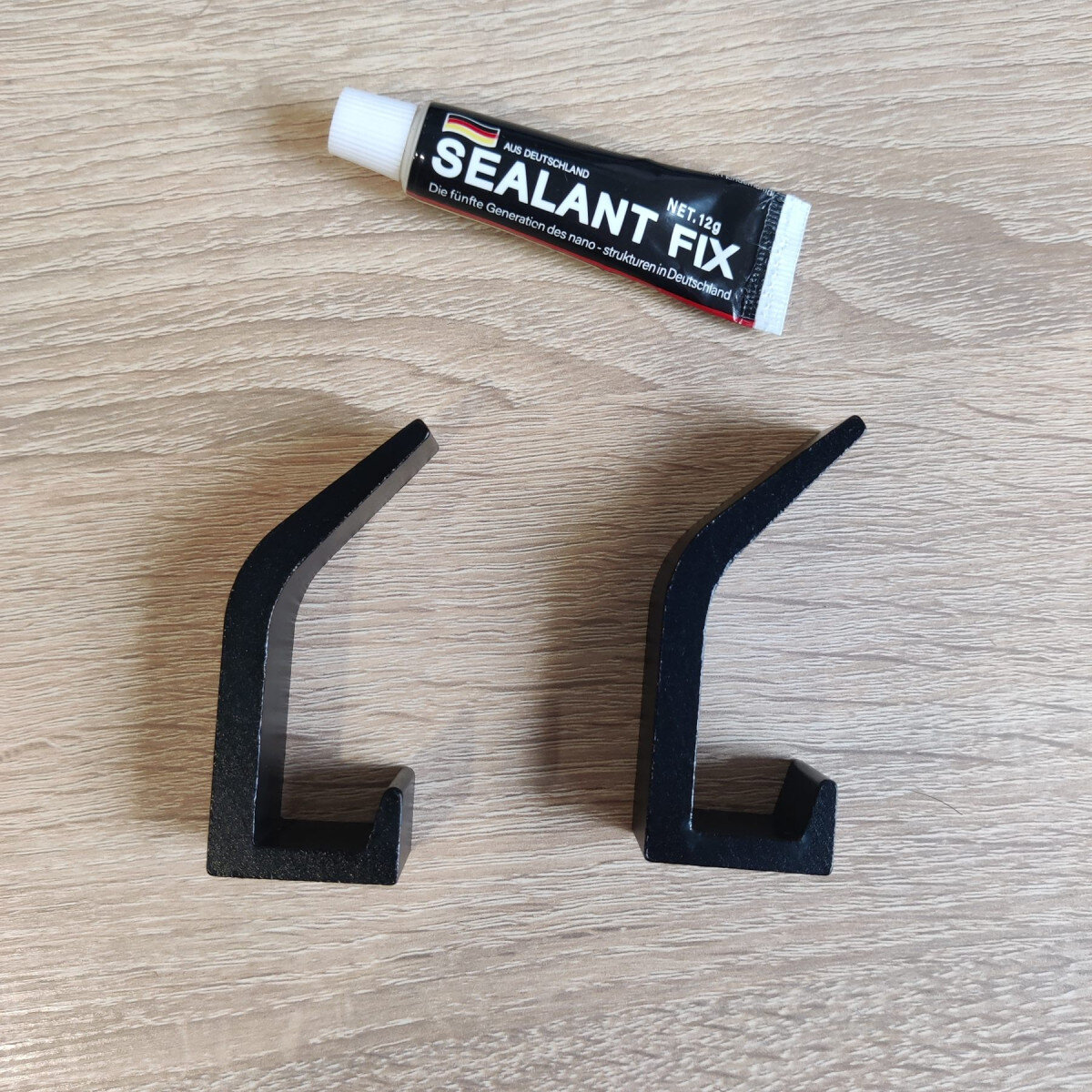 Гачок, що клеїться, виготовлений алюмінію. Витримує навантаження до 4 кг. Якість - середня, сліди фіксатора, який тримає гачок під час фарбування (див. фото) . Матові текстури.