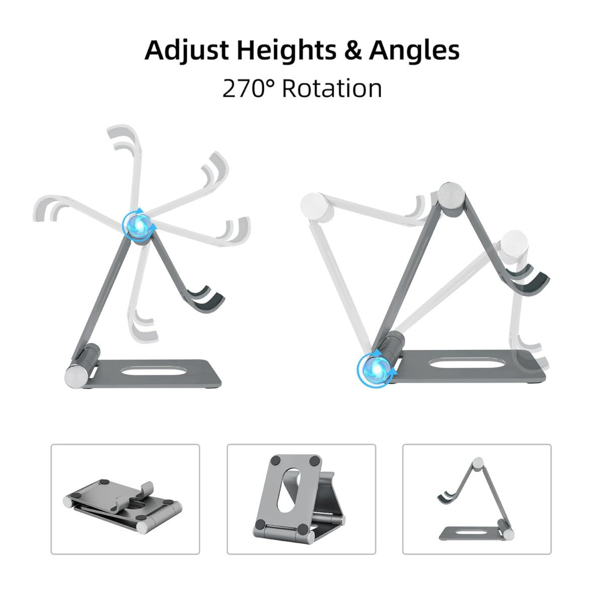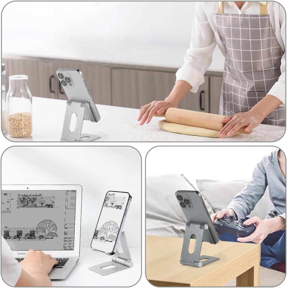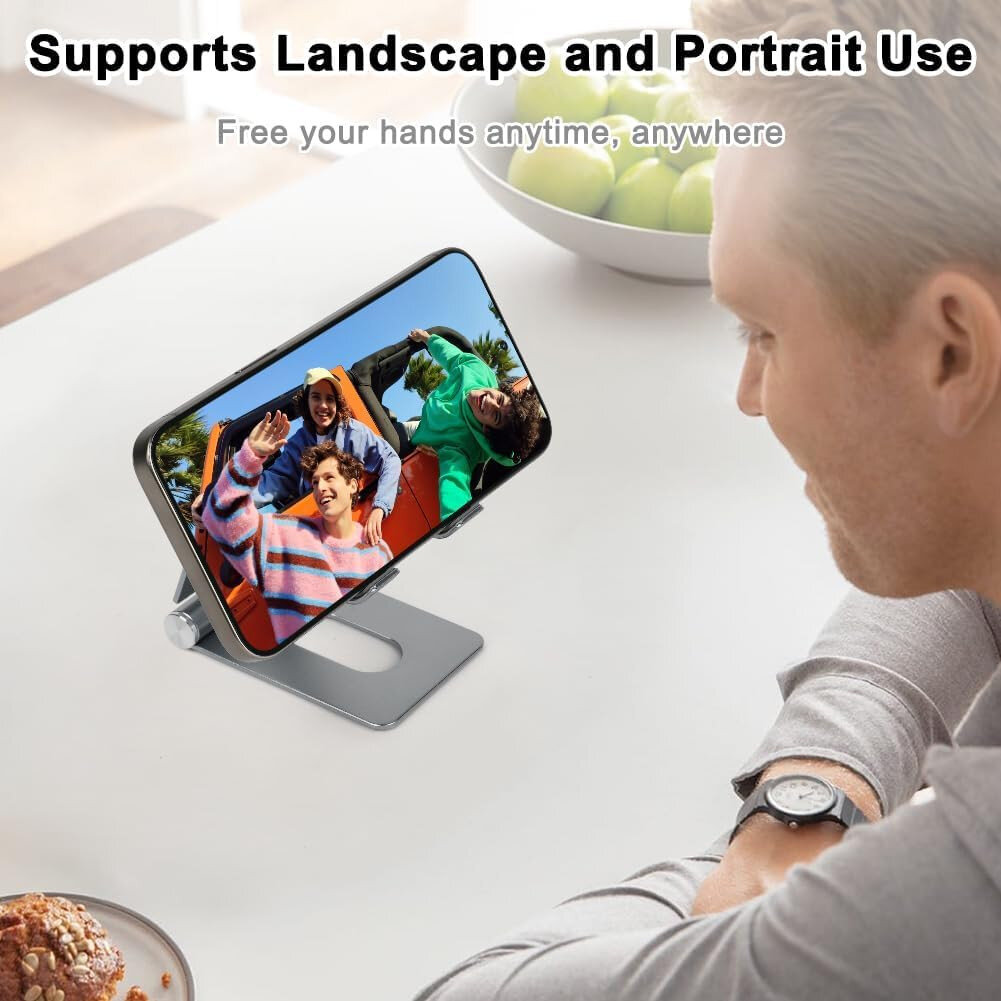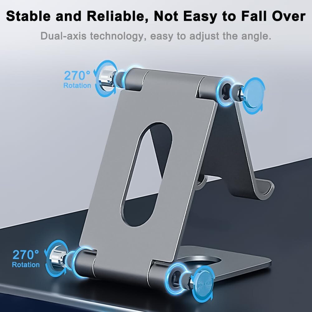 Складна і легка підставка з анодованого алюмінію, що підтримує смартфони, планшети та e‑ридери від 4 до 10 дюймів. Має регульований кут нахилу й поворот на 360°, підходить для перегляду відео, відеодзвінків або читання без утримання пристрою руками.