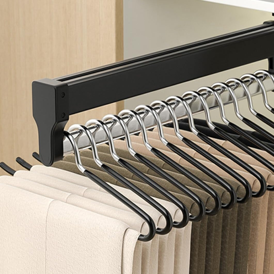 Висувна штанга-мікроліфт — це практичне та сучасне рішення для ефективної організації простору у шафі чи гардеробній. Завдяки телескопічному механізму повного висування забезпечує легкий доступ до речей навіть у найглибших нішах, що робить користування максимально зручним.