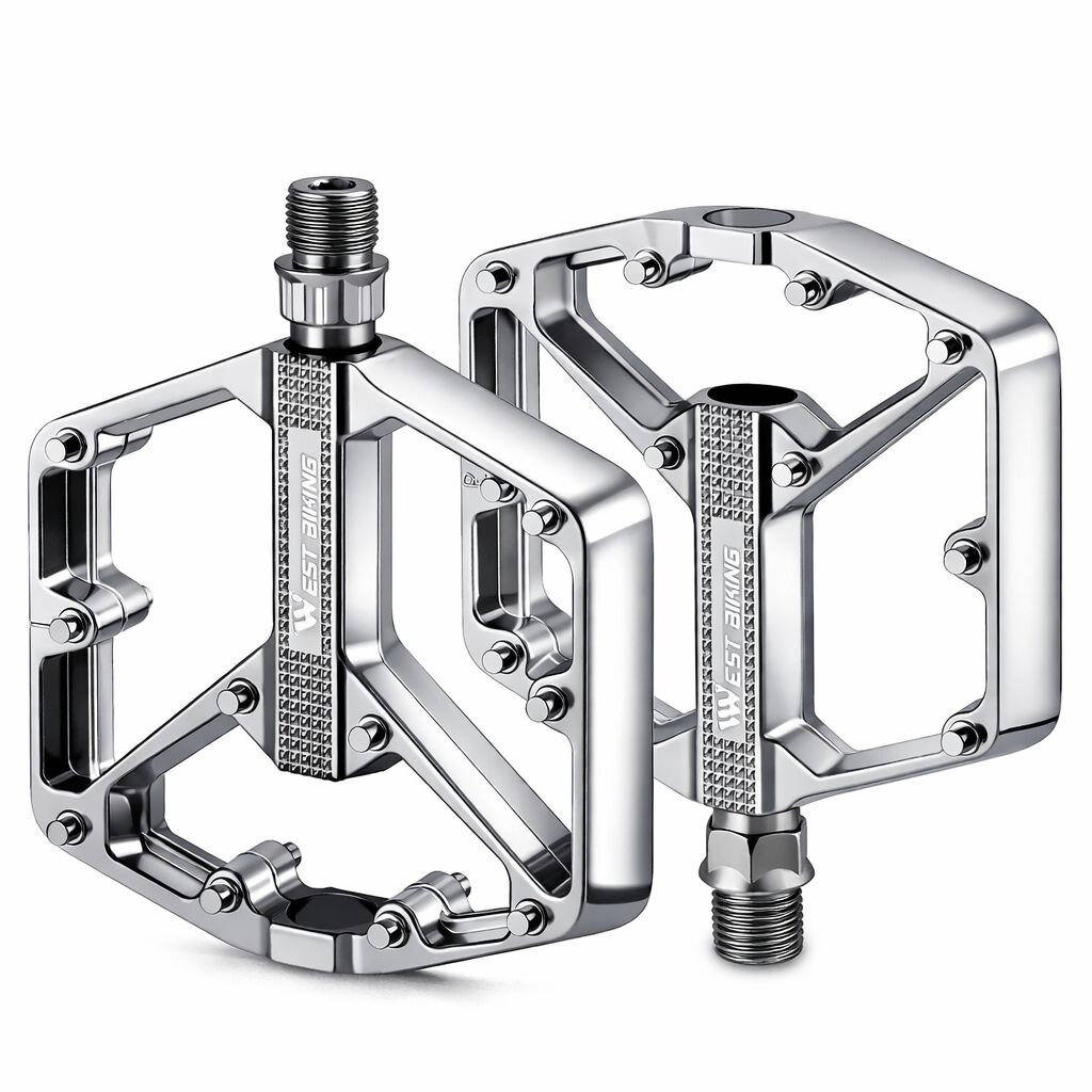 Педалі WEST BIKING виготовлені з алюмінієвого сплаву з точною CNC-обробкою та оснащені 2 підшипниками для плавного обертання і стабільної роботи під навантаженням. Конструкція поєднує легку вагу, міцну вісь із хромомолібденової сталі та широку платформу з протиковзкими шипами, що робить педалі зручними для щоденного катання та активної їзди.