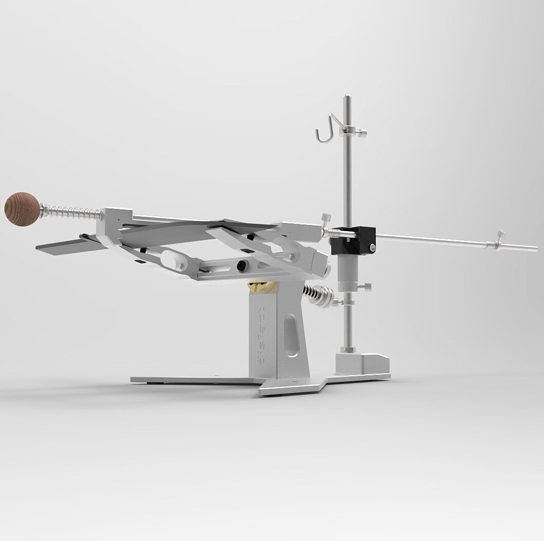 Верстат оснащений широкою рамкою для губок 18 см та губками довжиною 90 мм, що забезпечує надійний затиск клинка. Підтримується заточка в діапазоні 20–60°, а також передбачена можливість заточки в лінзу. Максимальна ширина клинка, що заточується, — до 45 см.